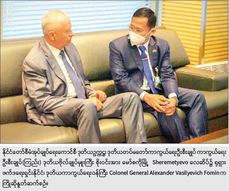ရုရှားဖက်ဒရေးရှင်းနိုင်ငံ၊ ကာကွယ်ရေးဝန်ကြီး Army General Kuzhugetovich Shoigu၏ ဖိတ်ကြားချက်အရ နိုင်ငံတော်စီမံအုပ်ချုပ်ရေးကောင်စီဥက္ကဋ္ဌ၊ တပ်မတော် ကာကွယ်ရေးဦးစီးချုပ် ဗိုလ်ချုပ်မှူးကြီး မင်းအောင်လှိုင် ကိုယ်စား နိုင်ငံတော်စီမံ အုပ်ချုပ်ရေးကောင်စီ ဒုတိယဥက္ကဋ္ဌ၊ ဒုတိယတပ်မတော် ကာကွယ်ရေးဦးစီးချုပ် ကာကွယ် ရေးဦးစီးချုပ်(ကြည်း) ဒုတိယဗိုလ်ချုပ်မှူးကြီး စိုးဝင်း ဦးဆောင်သည့် ကိုယ်စားလှယ်အဖွဲ့သည် ရုရှားဖက်ဒရေးရှင်း နိုင်ငံတွင် ကျင်းပပြုလုပ်လျက်ရှိသည့် International Army Games-2021 ပိတ်ပွဲအခမ်းအနားသို့ တက်ရောက်ရန်အတွက် စက်တင်ဘာ ၁ ရက် နံနက်ပိုင်းတွင် နေပြည်တော် တပ်မတော်လေဆိပ်မှ လေကြောင်းခရီးဖြင့် ထွက်ခွာခဲ့ရာ ညပိုင်းတွင် ရုရှားဖက်ဒရေးရှင်းနိုင်ငံ၊ မော်စကိုမြို့၊ Sheremetyevo လေဆိပ်သို့ ရောက်ရှိကြသည်။