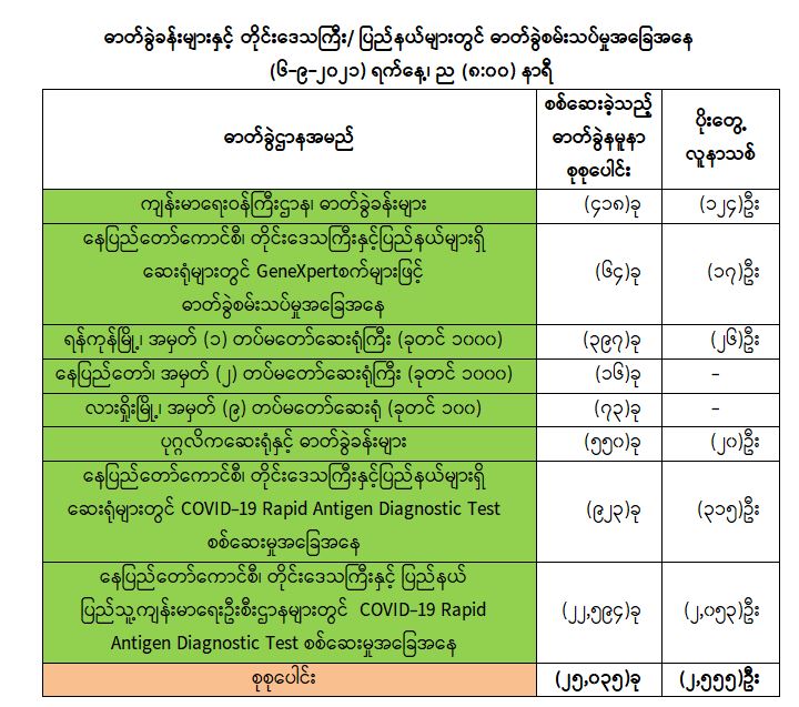 သို့ဖြစ်ပါ၍ ယနေ့အထိ ဓာတ်ခွဲနမူနာစုစုပေါင်း (၃,၈၀၆,၂၂၁)ခုအား စစ်ဆေးခဲ့ပြီး COVID-19 ဓာတ်ခွဲအတည်ပြုလူနာ စုစုပေါင်း (၄၁၇,၉၇၁) ဦး ရှိပြီ ဖြစ်ပါသည်။