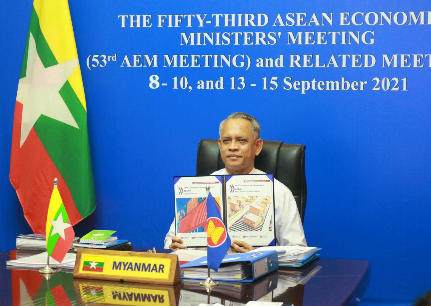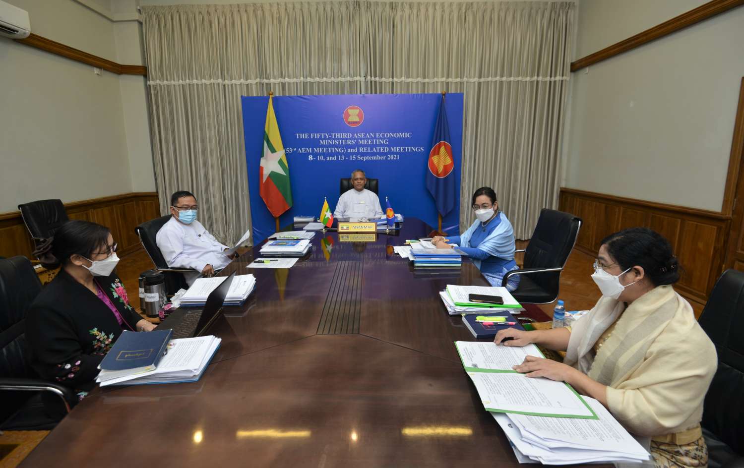 (၅၃) ကြိမ်မြောက် အာဆီယံစီးပွားရေးဝန်ကြီးများ အစည်းအဝေး ဒုတိယနေ့ကို ဗီဒီယို ကွန်ဖရင့်စနစ်ဖြင့် ဆက်လက်ကျင်းပခဲ့ရာ ရင်းနှီးမြှုပ်နှံမှုနှင့် နိုင်ငံခြားစီးပွားဆက်သွယ်ရေး ဝန်ကြီးဌာန၊ ပြည်ထောင်စုဝန်ကြီး ဦးအောင်နိုင်ဦးသည် နေပြည်တော်ရှိ ရင်းနှီးမြှုပ်နှံမှုနှင့် နိုင်ငံခြားစီးပွား ဆက်သွယ်ရေးဝန်ကြီးရုံးမှ ပါဝင်တက်ရောက်သည်။