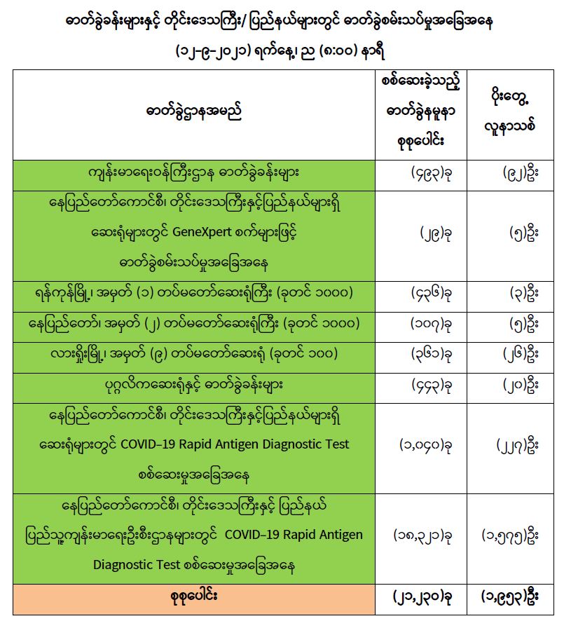 COVID-19 သံသယလူနာများ၊ ဓာတ်ခွဲအတည်ပြုလူနာနှင့် အနီးကပ်ထိတွေ့ခဲ့သူများနှင့် အသွားအလာကန့်သတ်ထားရှိသူများအား COVID-19 ရောဂါရှိ၊ မရှိ ဓာတ်ခွဲစမ်းသပ်စစ်ဆေးခြင်း အား ပုံမှန်ဆောင်ရွက်လျက်ရှိရာ (၁၁-၉-၂၀၂၁)ရက်နေ့၊ ည (၈:၀၀)နာရီမှ (၁၂-၉-၂၀၂၁)ရက်နေ့၊ ည (၈:၀၀) နာရီအတွင်း ဓာတ်ခွဲနမူနာစုစုပေါင်း (၂၁,၂၃၀)ခုအား စစ်ဆေးပြီးစီးခဲ့ရာ COVID-19 ရောဂါ ဓာတ်ခွဲအတည်ပြုလူနာသစ် (၁,၉၅၃)ဦးတွေ့ရှိရပါသည်။