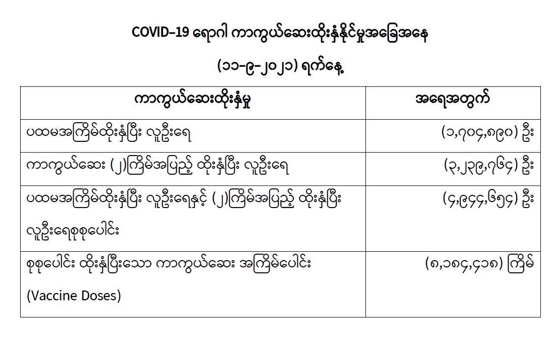 COVID-19 ရောဂါကာကွယ်ထိန်းချုပ်ရေးအတွက် တိုင်းဒေသကြီး/ပြည်နယ်များတွင် COVID-19 ရောဂါကာကွယ်ဆေးကို ဦးတည်အုပ်စုများသတ်မှတ်၍ ထိုးနှံပေးလျက်ရှိရာ (၁၁-၉-၂၀၂၁) ရက်နေ့အထိ လူဦးရေစုစုပေါင်း (၄,၉၄၄,၆၅၄) ဦးအား ထိုးနှံပေးပြီးဖြစ်၍ ကာကွယ်ဆေးနှစ် ကြိမ်အပြည့် ထိုးနှံပြီးစီးသူ (၃,၂၃၉,၇၆၄) ဦးနှင့် ပထမအကြိမ်ထိုးနှံပြီးစီးသူ (၁,၇၀၄,၈၉၀) ဦးရှိပြီဖြစ်ပါသည်။