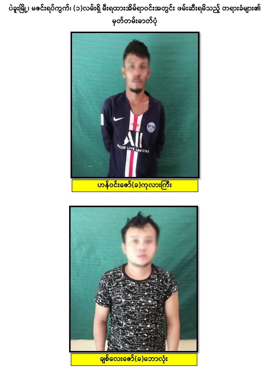 ဖမ်းဆီးရမိတရားခံများ၏ ထွက်ဆိုချက်များအရ ပဲခူးမြို့၊ မဇင်းရပ်ကွက်၊ မီးရထားအိမ်ယာဝန်း အတွင်း နေအိမ်တစ်လုံးအတွင်း၌ ဆက်စပ်တရားခံများ ရောက်ရှိနေကြောင်း သိရှိရသဖြင့် ယနေ့မွန်းလွဲ ၁ နာရီ ၂၅ မိနစ်တွင် ဝင်ရောက် ရှာဖွေခဲ့ရာ ဟန်ဇော်ဝင်း (ခ) ကုလားကြီး (ဘ) ဦးမောင်မောင်စန်း၊ ချစ်လင်းဇော် (ခ) ဘောလုံး (ဘ) ဦးသိန်းဇော်၊ အောင်ကျော် (ဘ) ဦးသက်ဦးနိုင်နှင့် စည်သူဖြိုး (ဘ) ဦးသန်းဌေး တို့အား ငွေကျပ် (၁၀) သိန်း ၊ လက်ပစ်ဗုံး ၁ လုံးနှင့်အတူ ဖမ်းဆီးရမိခဲ့ပြီး မွန်းလွဲ ၂ နာရီခွဲတွင် ပဲခူးမြို့နယ်၊ ရန်ကုန် - မန္တလေး လမ်းဟောင်းဘေး၊ ဇိုင်းတောင်ရပ်ကွက် “ကောင်းကြိုက်”ဒန်ပေါက်ဆိုင်ရှေ့တွင် ဆက်စပ် တရားခံ ရန်နိုင် (ဘ) ဦးစိုးရွှေ အား ထပ်မံဖမ်းဆီးရမိခဲ့သည်။