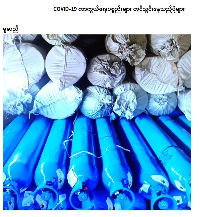 နိုင်ငံတော်အတွင်း၌ ကိုဗစ်-၁၉ ရောဂါကာကွယ်၊ ထိန်းချုပ်၊ ကုသရေးလုပ်ငန်းများအတွက် လိုအပ်သည့်ဆေးဝါးနှင့် ဆက်စပ်ပစ္စည်းများကို လေကြောင်း၊ ရေကြောင်းနှင့် နယ်စပ် ကုန်သွယ်ရေး စခန်းများမှ လွယ်ကူလျင်မြန်စွာ တင်သွင်းနိုင်ရေးအတွက် စီးပွားရေးနှင့် ကူးသန်းရောင်းဝယ်ရေး ဝန်ကြီးဌာနအနေဖြင့် သက်ဆိုင်ရာဌာနများနှင့် ညှိနှိုင်းထားသည့် SOP များနှင့်အညီ ဦးစားပေး တင်သွင်းခွင့် ပြုပေးလျက်ရှိရာ ယနေ့တွင် ရန်ကုန်အပြည်ပြည်ဆိုင်ရာ လေဆိပ်၊ ဆိပ်ကမ်းများနှင့် မူဆယ်၊ ချင်းရွှေဟော်၊ ကန်ပိုက်တီနှင့် မြဝတီကုန်သွယ်ရေးစခန်း (၄) ခု တို့မှ တင်သွင်းရာ၌ ကုမ္ပဏီ (၁၁) ခုမှ ယာဉ်စီးရေ (၂၄) စီးဖြင့် အောက်ဆီဂျင် (အရည်) (Bowser) ယာဉ် (၂) စီး (၃၉) တန်၊ အောက်ဆီဂျင် (အိုးခွံ) အခု(၂၇၉၀) ၊ Oxygen Plant (၆၈) ခု၊ အိမ်သုံး Oxygen Concentrator (၃၁၈) ခု၊ Tesk Kit အခု(၅၀၂၄၀)၊ PPE ဝတ်စုံ (၇၃၀၀)၊ လက်အိပ် (၂၉) တန် နှင့် နှာခေါင်းစည်း (Mask) (၆၃) တန်တင်သွင်းခဲ့သည်။ အောက်ဆီဂျင် (အရည်) (Bowser) ယာဉ် (၂) စီးမှာ ရန်ကုန် မြို့သို့ဖြစ်ပြီး၊ Oxygen Plant (၆၈) ခုမှာ ရန်ကုန် မြို့သို့ (၆၄)ခု၊ မန္တလေးမြို့၊ မြစ်ကြီးနားမြို့၊ ဖားကန့်မြို့နှင့် မိုးကောင်းမြို့တို့ သို့ (၁) ခုစီ ဖြစ်ကြောင်း သိရသည်။