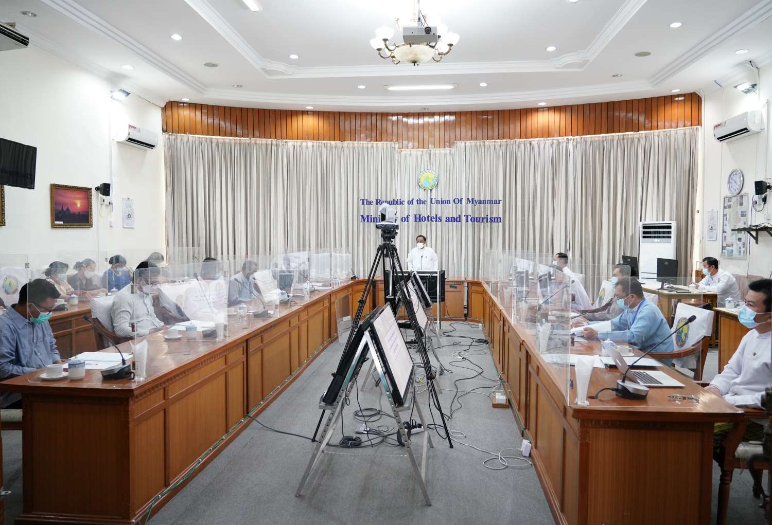 ဟိုတယ်နှင့် ခရီးသွားလာရေးဝန်ကြီးဌာန ပြည်ထောင်စုဝန်ကြီး ဒေါက်တာဌေးအောင်သည် ကိုဗစ်-၁၉ ကပ်ရောဂါကြောင့် ထိခိုက်ဆုံးရှုံးခဲ့ရသည့် ခရီးသွားလုပ်ငန်းနှင့် ဆက်စပ်နေသော စီးပွားရေးလုပ်ငန်းများကို ကုစားမှုများပေးနိုင်ရေးအတွက် ဟိုတယ်များတွင် ကိုဗစ်-၁၉ လုပ်ငန်း လမ်းညွှန်များနှင့်အညီ ဟိုတယ်ဝန်ဆောင်မှုလုပ်ငန်းများ ဆောင်ရွက်နေမှုကို နိုင်ငံပိုင် မီဒီယာများနှင့် လူမှုကွန်ယက်မီဒီယာများတွင် ထုတ်လွှင့်ပြသနိုင်ရေး ရုပ်သံရိုက်ကူးရေး ဆောင်ရွက်နိုင်ရန် နေပြည်တော်ရှိ ဟိုတယ်များမှ အထွေထွေမန်နေဂျာများနှင့် Elite Technology မှ တာဝန်ရှိသူများနှင့် တွေ့ဆုံညှိနှိုင်းအစည်းအဝေးကို ယနေ့ နံနက်ပိုင်းတွင် ဝန်ကြီးဌာန နီလာအစည်းအဝေးခန်းမ၌ ပြုလုပ်သည်။