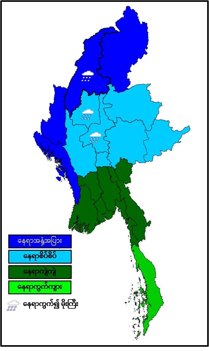 မနက်ဖြန်နံနက်အထိခန့်မှန်းချက်။ တနင်္သာရီတိုင်းဒေသကြီးတွင် နေရာကွက်ကျား၊ ပဲခူးတိုင်းဒေသကြီး၊ ရန်ကုန်တိုင်းဒေသကြီး၊ ဧရာဝတီတိုင်းဒေသကြီး၊ ကယားပြည်နယ်၊ ကရင်ပြည်နယ်နှင့် မွန်ပြည်နယ်တို့တွင် နေရာကျဲကျဲ၊ နေပြည်တော်၊ စစ်ကိုင်းတိုင်းဒေသကြီးအောက်ပိုင်း၊မန္တလေးတိုင်းဒေသကြီး၊ မကွေးတိုင်းဒေသကြီးနှင့် ရှမ်းပြည်နယ်တို့တွင် နေရာစိပ်စိပ်နှင့် ကျန်တိုင်းဒေသကြီးနှင့် ပြည်နယ်တို့တွင် နေရာအနှံ့အပြား မိုးထစ်ချုန်းရွာပြီး၊ စစ်ကိုင်းတိုင်းဒေသကြီးနှင့် မန္တလေးတိုင်းဒေသကြီးတို့တွင် နေရာကွက်၍ မိုးကြီးနိုင်ပါသည်။ ရွာရန်ရာနှုန်းပြည့် ဖြစ်ပါသည်။
