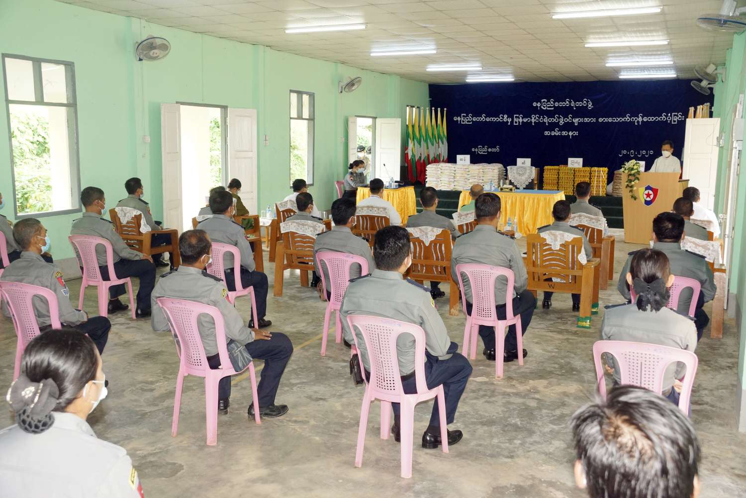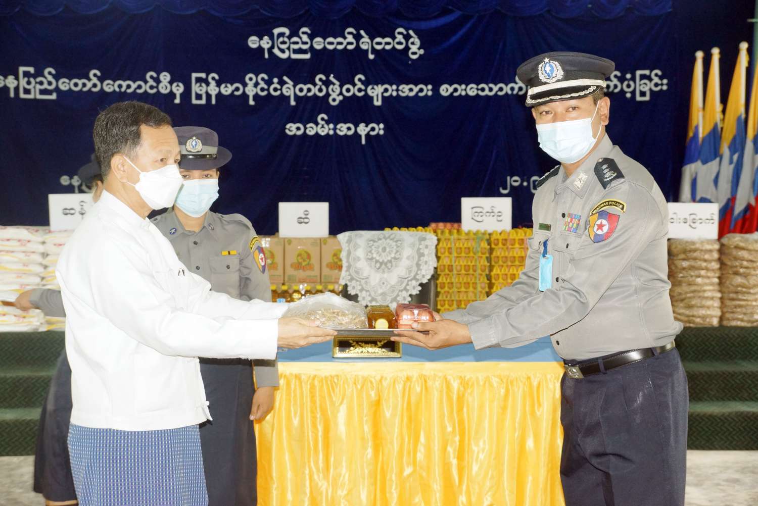 ထို့နောက် နေပြည်တော်ကောင်စီဥက္ကဋ္ဌက နေပြည်တော် ရဲတပ်ဖွဲ့မှ တပ်ဖွဲ့ဝင်များကို ဆန်၊ ဆီ၊ ကြက်ဥ၊ ငါးခြောက် စသည့် စားသောက်ကုန် များထောက်ပံ့ပေးအပ်ရာ နေပြည်တော် ကောင်စီအဖွဲ့ဝင် နေပြည်တော် ရဲတပ်ဖွဲ့မှူး ရဲမှူးကြီး ကိုကိုလွင်က လက်ခံရယူပြီး စားသောက်ကုန်များ ထောက်ပံ့ခြင်း နှင့်ပတ်သက်၍ ကျေးဇူးတင်စကား ပြောကြား သည်။