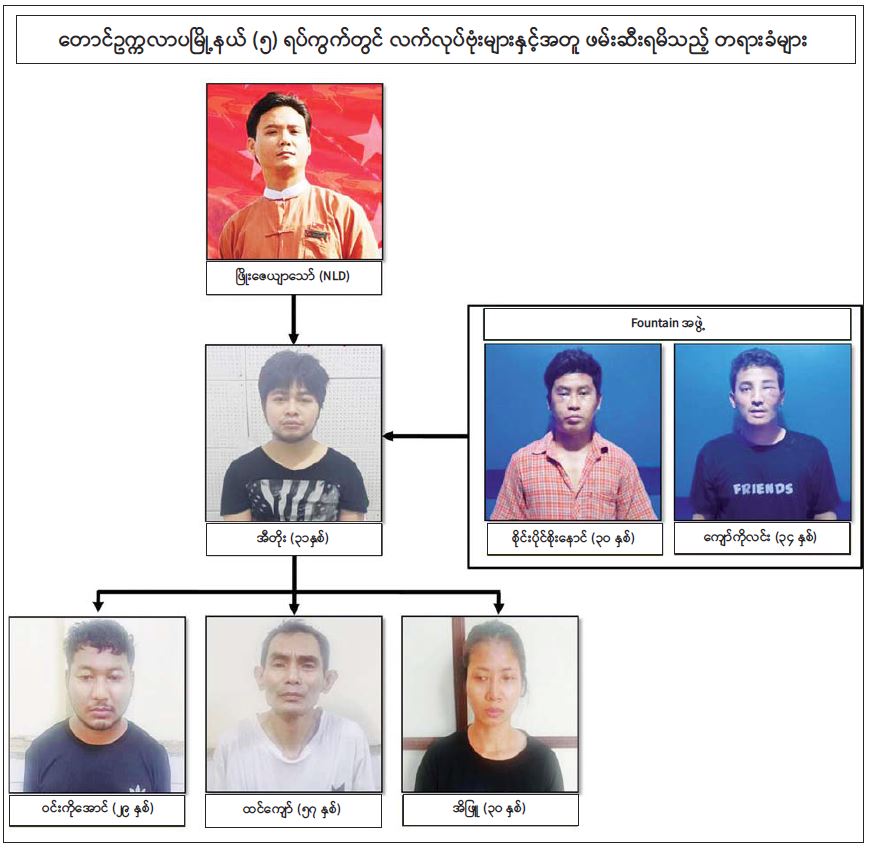 ကျော်ကိုလင်း(ခ) AJ နှင့် စိုင်းပိုင်စိုးနောင်(ခ) မာဝီ တို့သည် ဖောက်ခွဲရေး လုပ်ငန်းများ လုပ်ဆောင်ရန် မေရီယန် (ဖမ်းဆီးရန်ကျန်) ၏ ချိတ်ဆက်ပေးပို့သော လက်လုပ်ချိန်ကိုက်မိုင်း (၄)လုံးအား သွားရောက်ယူဆောင်ခဲ့ကြောင်း ဖော်ထုတ် သိရှိရ သည်။