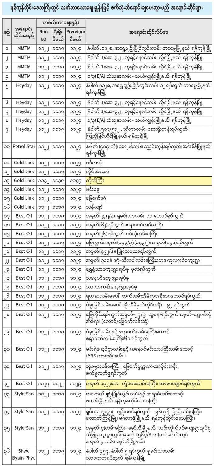 စီးပွားရေးနှင့် ကူးသန်းရောင်းဝယ်ရေးဝန်ကြီးဌာနနှင့် မြန်မာနိုင်ငံ စက်သုံးဆီတင်သွင်း ဖြန့်ဖြူးရောင်းချ ရေးအသင်းတို့ ပူးပေါင်းစီစဉ်မှုဖြင့် ပြည်သူများသက်သာသောဈေးနှုန်းဖြင့် ဝယ်ယူရရှိနိုင်ရန် ရည်ရွယ်၍ ဗဟိုဘဏ်မှ ရည်ညွှန်းငွေလဲနှုန်းဖြင့် တိုက်ရိုက်ရောင်းချပေးသည့် နိုင်ငံခြားငွေဖြင့် မှာယူတင်သွင်းခဲ့သည့် စက်သုံးဆီများကို စက်တင်ဘာ ၂၂ ရက်မှ စတင်ရောင်းချလျက်ရှိပြီး ယနေ့မှစ၍ ရန်ကုန်တိုင်းဒေသကြီး၊ မန္တလေးတိုင်းဒေသကြီးနှင့် နေပြည်တော်တို့တွင် အောက်ဖော်ပြပါ ဈေးနှုန်းများအတိုင်း ရောင်းချပေး သွားမည်ဖြစ်သည်-