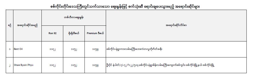 စီးပွားရေးနှင့်ကူးသန်းရောင်းဝယ်ရေးဝန်ကြီးဌာနနှင့် မြန်မာနိုင်ငံ စက်သုံးဆီ တင်သွင်းဖြန့်ဖြူး ရောင်းချရေးအသင်းတို့ ပူးပေါင်းစီစဉ်မှုဖြင့် ပြည်သူများ သက်သာသောဈေးနှုန်းဖြင့် ဝယ်ယူရရှိနိုင်ရန်ရည်ရွယ်၍ ဗဟိုဘဏ်မှ ရည်ညွှန်းငွေ လဲနှုန်းဖြင့် တိုက်ရိုက်ရောင်းချပေးသည့် နိုင်ငံခြားငွေဖြင့် မှာယူတင်သွင်းခဲ့သည့် စက်သုံးဆီများကို စက်တင်ဘာ ၂၂ ရက်မှ စတင်၍ ဖြန့်ဖြူးရောင်းချပေးလျက်ရှိပြီး ရန်ကုန်တိုင်းဒေသကြီး၊ မန္တလေးတိုင်းဒေသကြီးနှင့် နေပြည်တော်တို့တွင် သတ်မှတ်ဈေးနှုန်းဖြင့် ရောင်းချပေးနေသည့် အရောင်းဆိုင်များစာရင်းနှင့် ဈေးနှုန်းများကို စက်တင်ဘာ ၂၆ ရက်ထုတ် နိုင်ငံပိုင်သတင်းစာများတွင် ဖော်ပြခဲ့ပြီးဖြစ်သည်။