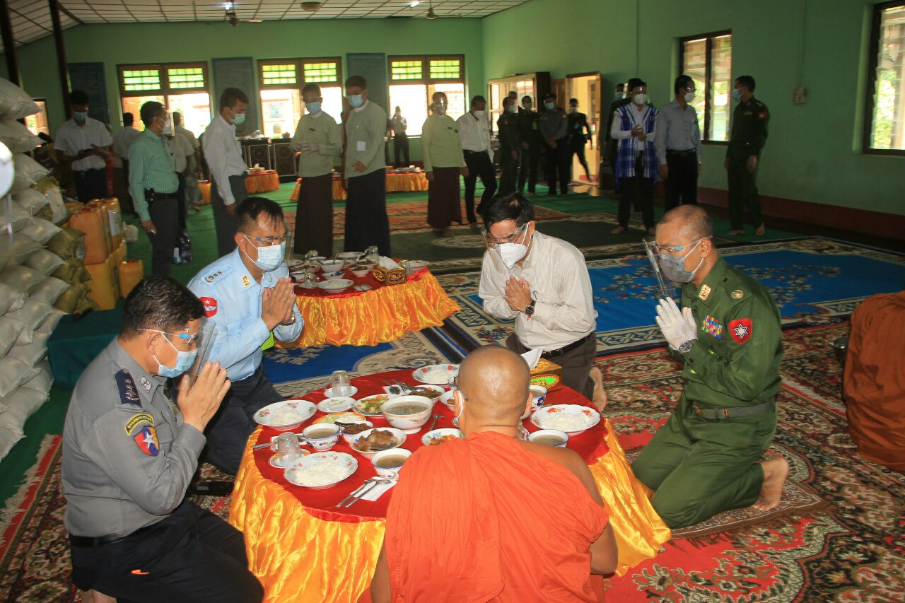 ပဲခူးတိုင်းဒေသကြီးအစိုးရအဖွဲ့ တိုင်းဒေသကြီးဝန်ကြီးချုပ် ဦးမျိုးဆွေဝင်းသည် တောင်ပိုင်းတိုင်း စစ်ဌာနချုပ်တိုင်းမှူး ဗိုလ်မှူးချုပ်ထိန်ဝင်း၊ တိုင်းဒေသကြီးဝန်ကြီးများ၊ တာဝန်ရှိသူများနှင့်အတူ ယမန်နေ့ နံနက်ပိုင်းက တောင်ငူမြို့ ကြာနီကန်ပရိယတ္တိစာသင်တိုက်သို့ သွားရောက်၍ တောင်ငူမြို့ရှိ ပရိယတ္တိစာသင်တိုက် (၄) တိုက် နှင့် သီလရှင်စာသင် တိုက်(၁)တိုက်တို့အတွက် ဆွမ်းဆန်(၆၃)အိတ်၊ ဆီ(၁၅၇) ပိဿာ၊ ပဲ(၁၅၇)ပိဿာ၊ ဆား(၁၅၇)ပိဿာ၊ ကျန်းမာရေးသုံး အထောက်အကူပြုပစ္စည်းများနှင့် နဝကမ္မအလှူငွေကျပ်(၅)သိန်းတို့ကို ဆက်ကပ်လှူဒါန်းပြီး ဆရာတော်၊ သံဃာတော် များအား နေ့ဆွမ်းဆက်ကပ်လှူဒါန်းကြသည်။