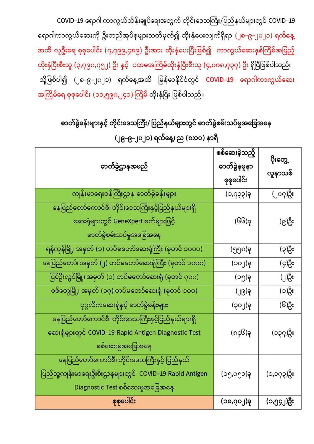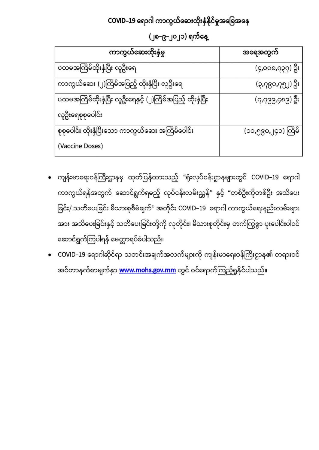 COVID-19 ရောဂါစောင့်ကြပ်ကြည့်ရှုမှုနှင့်ပတ်သက်၍သတင်းထုတ်ပြန်ခြင်း(၂၉-၉-၂၀၂၁) ရက်နေ့၊ ည (၈:၀၀)နာရီ 09/29/2021