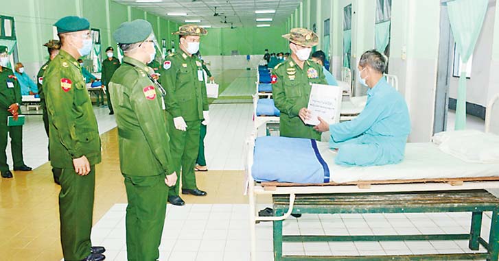 ကရင်ပြည်နယ် သံတောင်ကြီးမြို့ရှိ နယ်မြေခံ တပ်မတော်ဆေးရုံ၌ တက်ရောက်ဆေးကုသမှု ခံယူ လျက်ရှိသော အရာရှိ၊ စစ်သည်၊ မိသားစုများနှင့် ဒေသခံပြည်သူများအား စက်တင်ဘာ ၂၉ ရက် မွန်းလွဲပိုင်းတွင် ကာကွယ်ရေးဦးစီးချုပ်ရုံး(ကြည်း) မှ ဒုတိယဗိုလ်ချုပ်ကြီး ဖုန်းမြတ်၊ တောင်ပိုင်းတိုင်း စစ်ဌာနချုပ်တိုင်းမှူး ဗိုလ်မှူးချုပ် ထိန်ဝင်းနှင့် အဖွဲ့ဝင်များက လည်းကောင်း၊ တနင်္သာရီတိုင်းဒေသကြီး ကော့သောင်းမြို့ရှိ နယ်မြေခံ တပ်မတော်ဆေးရုံတွင် တက်ရောက် ဆေးကုသမှု ခံယူလျက်ရှိသော အရာရှိ၊ စစ်သည်၊ မိသားစုများနှင့် ဒေသခံပြည်သူများအား ယနေ့ နေ့လယ်ပိုင်းတွင် ကာကွယ်ရေးဦးစီးချုပ်ရုံး (ကြည်း) မှ ဒုတိယဗိုလ်ချုပ်ကြီးအောင်စိုး၊ ကမ်းရိုးတန်းဒေသ တိုင်းစစ်ဌာနချုပ် တိုင်းမှူး ဗိုလ်ချုပ် စောသန်းလှိုင်နှင့် အဖွဲ့ဝင်များကလည်း ကောင်း အသီးသီးသွားရောက်ကြည့်ရှု၍ တစ်ဦးချင်း၏ ရောဂါဖြစ်ပွားမှု၊ ဆေးဝါးကုသပေးထားမှုနှင့် ကျန်းမာရေး တိုးတက်ကောင်းမွန်မှု အခြေအနေများကို မေးမြန်းအားပေးစကား ပြောကြားပြီး စားသောက်ဖွယ်ရာများ ပေးအပ်သည်။
