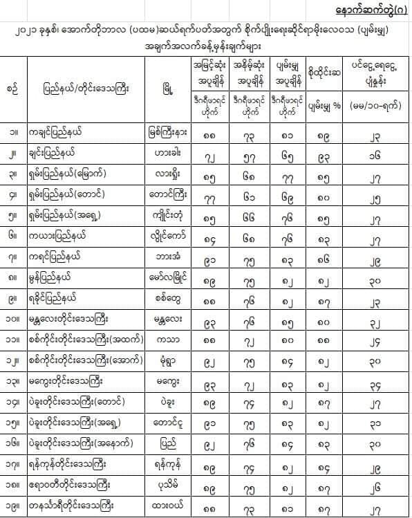 မိုးအခြေအနေ--မိုးရွာသွန်းမှုအခြေအနေမှာ- ရှမ်းပြည်နယ်(အရှေ့ပိုင်းနှင့်တောင်ပိုင်း)နှင့် ကယားပြည်နယ်တို့တွင် ရွာသွန်းမြဲ ထက်ပိုနိုင်ပြီး၊ ဧရာဝတီတိုင်းဒေသကြီး၊ ချင်းပြည်နယ်နှင့် ရခိုင်ပြည်နယ်တို့တွင် ရွာသွန်းမြဲအောက်လျော့နည်းနိုင်ကာ၊ နေပြည်တော်၊ စစ်ကိုင်းတိုင်းဒေသကြီး၊ မန္တလေးတိုင်းဒေသကြီး၊ မကွေးတိုင်းဒေသကြီး၊ ပဲခူးတိုင်းဒေသကြီး၊ ရန်ကုန်တိုင်းဒေသကြီး၊ တနင်္သာရီတိုင်းဒေသကြီး၊ ကချင်ပြည်နယ်၊ ရှမ်းပြည်နယ်(မြောက်ပိုင်း)၊ ကရင်ပြည်နယ်နှင့် မွန်ပြည်နယ်တို့တွင် ရွာသွန်း မြဲခန့် မိုးထစ်ချုန်းရွာနိုင်ပါသည်။