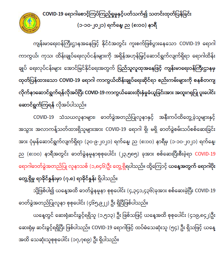 COVID-19 ရောဂါ စောင့်ကြပ်ကြည့်ရှုမှုနှင့် ပတ်သက်၍ သတင်းထုတ်ပြန်ခြင်း (၁-၁၀-၂၀၂၁) ရက်နေ့၊ ည (၈:၀၀)နာရီ 10/01/2021