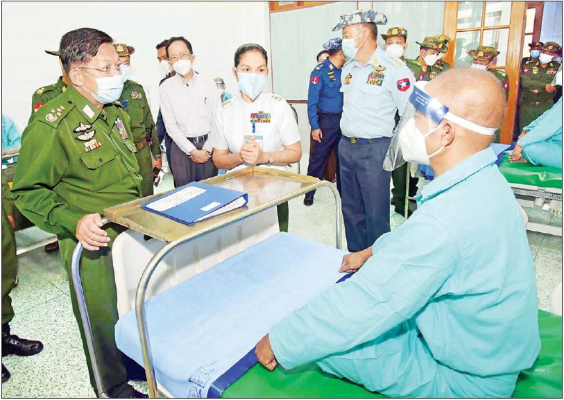 ယင်းနောက် နိုင်ငံတော်စီမံအုပ်ချုပ်ရေး ကောင်စီဥက္ကဋ္ဌ တပ်မတော် ကာကွယ်ရေးဦးစီးချုပ်နှင့် အဖွဲ့ဝင်များသည် ဆေးရုံတက်ရောက်ကုသလျက်ရှိသူများအား ရင်းရင်းနှီးနှီး လိုက်လံနှုတ်ဆက် အားပေးစကားပြောကြားပြီး စားသောက်ဖွယ်ရာများနှင့် ထောက်ပံ့ချီးမြှင့်ငွေများ ပေးအပ်သည်။