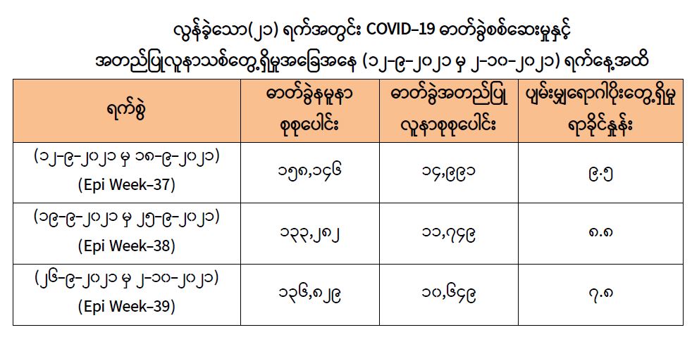 ကျန်းမာရေးဝန်ကြီးဌာနအနေဖြင့် COVID-19 ရောဂါကူးစက်ဖြစ်ပွားမှု အခြေအနေများအား ကူးစက်ရောဂါစောင့်ကြပ်ကြည့်ရှုရေး ရက်သတ္တပတ်အလိုက် ဓာတ်ခွဲနမူနာရယူစစ်ဆေးမှု၊ ဓာတ်ခွဲအတည်ပြုလူနာတွေ့ရှိရမှုနှင့် ရောဂါပိုးတွေ့ရှိမှုရာခိုင်နှုန်း အခြေအနေများအား စောင့်ကြပ် ကြည့်ရှုလျက်ရှိရာ အပတ်စဉ်(၃၇) တွင် ဓာတ်ခွဲနမူနာစုစုပေါင်း (၁၅၈,၁၄၆) ခု အား စမ်းသပ်စစ်ဆေးခဲ့ရာ ဓာတ်ခွဲအတည်ပြုလူနာ စုစုပေါင်း (၁၄,၉၉၁) ဦး ရှိသဖြင့် ပျမ်းမျှရောဂါပိုး တွေ့ရှိမှုနှုန်း (၉.၅) ရာခိုင်နှုန်း၊ အပတ်စဉ်(၃၈) တွင် ဓာတ်ခွဲနမူနာ စုစုပေါင်း (၁၃၃,၂၈၂) ခုအား စမ်းသပ်စစ်ဆေးခဲ့ရာ ဓာတ်ခွဲအတည်ပြုလူနာ စုစုပေါင်း (၁၁,၇၄၉) ဦး ရှိသဖြင့် ပျမ်းမျှရောဂါ ပိုးတွေ့ရှိမှုနှုန်း (၈.၈) ရာခိုင်နှုန်းနှင့် အပတ်စဉ်(၃၉) တွင် ဓာတ်ခွဲနမူနာ စုစုပေါင်း (၁၃၆,၈၂၉)ခု အား စမ်းသပ်စစ်ဆေးခဲ့ရာ ဓာတ်ခွဲ အတည်ပြုလူနာ စုစုပေါင်း (၁၀,၆၄၉)ဦးရှိသဖြင့် ပျမ်းမျှ ရောဂါပိုးတွေ့ရှိမှုနှုန်း (၇.၈)ရာခိုင်နှုန်း တို့ဖြစ်ကြောင်း တွေ့ရှိရ သဖြင့် ဓာတ်ခွဲအတည်ပြုလူနာ တွေ့ရှိရမှုမှာ လျော့နည်းလာခဲ့ပြီး ပျမ်းမျှရောဂါပိုးတွေ့ရှိမှု ရာခိုင်နှုန်းလည်း လျော့နည်းလာကြောင်း တွေ့ရှိရပါသည်။ ထိုသို့ ရောဂါကူးစက်မှုလျော့နည်း လာရခြင်းမှာ ကျန်းမာရေးဝန်ကြီးဌာန၏ ရောဂါကာကွယ်၊ ထိန်းချုပ်၊ ကုသရေးလုပ်ငန်းများ တွင် ပြည်သူလူထု၏ အားတက်သရော ပူးပေါင်းပါဝင် ဆောင်ရွက်မှုကြောင့်ဖြစ်သဖြင့် ပြည်သူလူထုအနေဖြင့် မိမိတို့ကဏ္ဍအလိုက် COVID-19 ရောဂါထိန်းချုပ်ရေးလုပ်ငန်းများတွင် ယခုထက် ပိုမိုပူးပေါင်းပါဝင်ဆောင်ရွက်ကြရန် တိုက်တွန်းနှိုးဆော်အပ်ပါသည်။