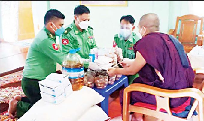 အလားတူ ရန်ကုန်တိုင်းဒေသကြီး၊ လှည်းကူးမြို့နယ်၊ အင်းတိုင်ကျေးရွာရှိ ရွှေလမင်းသာပုဗ္ဗာရုံကျောင်းတိုက်၊ သန်လျင်မြို့နယ်၊ အမှုထမ်းရပ်ကွက်ရှိ မိုင်းယောင်း ကျောင်းတိုက်၊ ဧရာဝတီတိုင်းဒေသကြီး၊ ပုသိမ်မြို့ရှိ လယ်တီကျောင်းတိုက်နှင့် မန္တလေး တိုင်းဒေသကြီး၊ ချမ်းအေးသာစံမြို့နယ်၊ ပက်ကုန်းပျော်ဘွယ်ရပ်ရှိ မဟာဝိဇိတာရုံ ပရိယတ္တိစာသင်တိုက်တို့မှ ဆရာတော်၊ သံဃာတော်များနှင့် သာသနာနွယ်ဝင် သီလရှင်များအတွက် ဆွမ်းဆန်တော်၊ ဆီ၊ ဆား၊ ပဲ အမယ်(၄)မျိုး၊ နေ့ဆွမ်းများ၊ ကိုဗစ်-၁၉ ရောဂါကာကွယ်ရေး အထောက်အကူပြုပစ္စည်းများနှင့် လှူဖွယ်ပစ္စည်းများကို တိုင်းစစ် ဌာနချုပ်အသီးသီးမှ တိုင်းမှူးများနှင့် တာဝန်ရှိသူများက သွားရောက်ဆက်ကပ်လှူဒါန်းကြသည်။ ထို့အပြင် ဧရာဝတီတိုင်းဒေသကြီး၊ ပုသိမ်မြို့၊ လယ်တီကျောင်းတိုက်မှ သံဃာတော်များအား အနောက်တောင်တိုင်းစစ်ဌာနချုပ်ရှိ နယ်မြေခံဆေးအဖွဲ့က လိုအပ်သည့် ကျန်းမာရေးစစ်ဆေးပေးခြင်းများ ဆောင်ရွက်ပေးခဲ့ကြောင်း သိရသည်။