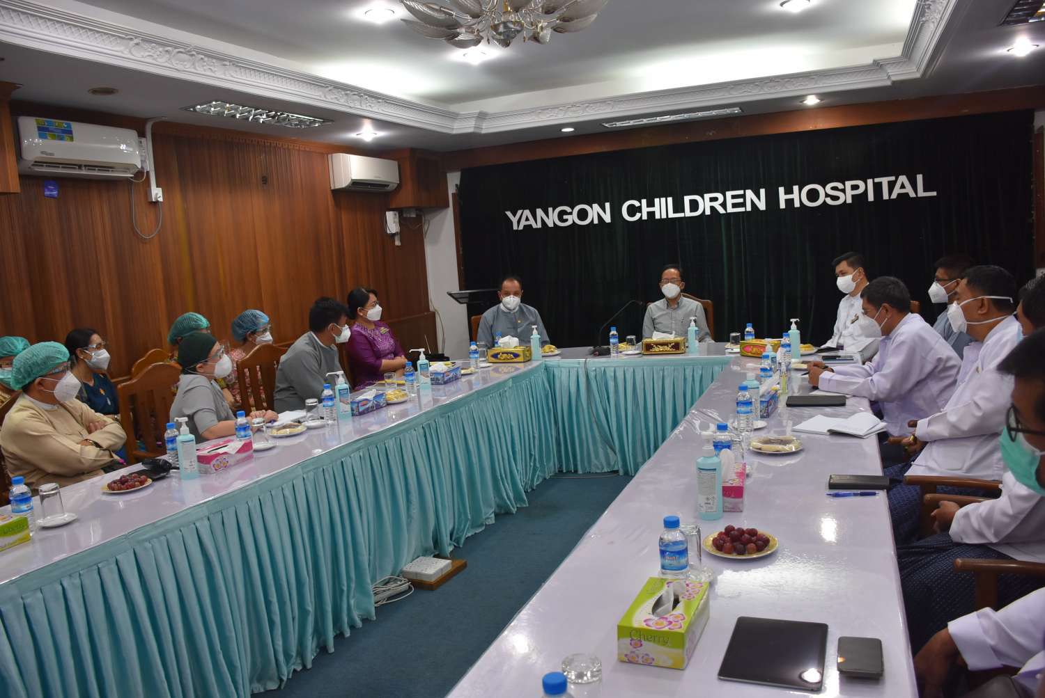ထို့နောက် ပြည်ထောင်စုဝန်ကြီးသည် ကလေးဆေးရုံကြီး-ရန်ကုန်မြို့သို့ သွားရောက်ကာ ဆေးရုံအုပ်ကြီး၊ ပါမောက္ခ/အထူးကုဆရာဝန်ကြီးများ၊ ဆေးရုံဝန်ထမ်းများ၊ ခုတင် (၅၅၀) ဆံ့ ကလေး ဆေးရုံကြီး-ရန်ကုန်မှ ဆေးရုံအုပ်ကြီး၊ ပါမောက္ခ/အထူးကုဆရာဝန်ကြီးများကို စုစည်း တွေ့ဆုံသည်။ တွေ့ဆုံစဉ် ပြည်ထောင်စုဝန်ကြီးက ဆေးရုံသုံးပစ္စည်းများ ပြင်ဆင်ထိန်းသိမ်းရန် ရန်ပုံငွေလိုအပ်ချက် ဖြည့်ဆည်းပေးလျက် ရှိပါကြောင်း၊ ဆေးဝါးလိုအပ်ချက် မရှိစေရန် စီစဉ် ဆောင်ရွက်စေလိုပါကြောင်း၊ အခြေခံပညာကျောင်းသား/သူများအား ကာကွယ်ဆေးထိုးနှံရာတွင် ဆေးတက္ကသိုလ်များမှ ဆရာ/ ဆရာမများ ပူးပေါင်းကူညီပေးစေလိုပါကြောင်း၊ အရေးပေါ် ကလေးလူနာများအား ကုသမှုလုပ်ငန်း မလစ်ဟင်းစေရန် ညှိနှိုင်းဆောင်ရွက်စေလိုပါကြောင်း၊ နိုင်ငံတော်အထောက်အပံ့ဖြင့် သူနာပြု/ သားဖွား သင်တန်းတက်ရောက် အောင်မြင်ထားသူများ လုပ်ငန်းခွင် အမြန်ဝင်ရောက်ရေး စည်းရုံး ဆောင်ရွက်ပေးရန် ဖြစ်ကြောင်း မှာကြားသည်။