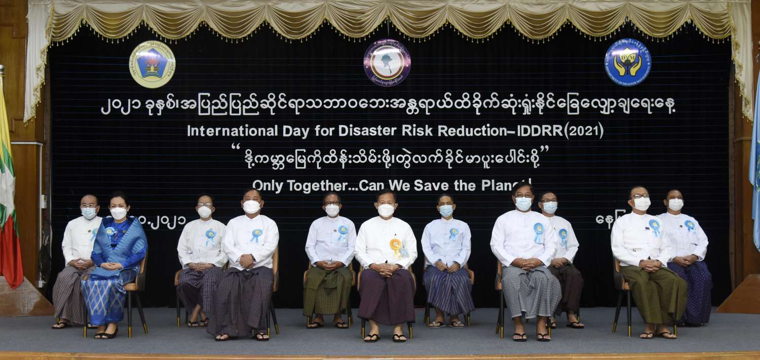မြန်မာနိုင်ငံအနေဖြင့် ယိုဂိုမူဘောင်နှင့် ဆန်ဒိုင်း မူဘောင်ပါလုပ်ငန်းစဉ်များနှင့်အညီ နိုင်ငံ၏ရေမြေသဘာဝနှင့် တည်ရှိမှုအနေ အထားများအရ ဖြစ်ပွားလေ့ရှိသည့် ဘေးအန္တရာယ်များကို မိမိတို့တွင်ရှိသည့် အရင်းအမြစ်များနှင့် လိုက်လျောညီထွေသော လုပ်ငန်းစီမံချက်များ၊ ဖွဲ့စည်းဆောင်ရွက်မှုများဖြင့် စီမံခန့်ခွဲအကောင်အထည်ဖော် ဆောင်ရွက်ခဲ့ပါကြောင်း၊ အပြည်ပြည်ဆိုင်ရာ သဘာဝဘေးအန္တရာယ် လျော့ပါးရေးနေ့ အထိမ်းအမှတ် အခမ်းအနားများကို (၂၀၁၀)ပြည့်နှစ်ကစပြီး နှစ်စဉ်မပျက် ကျင်းပခဲ့ပါကြောင်း၊ ကျင်းပသည့်အခါတွင် ဦးတည်ကဏ္ဍများ၊ လုပ်ငန်းနယ်ပယ်များအလိုက် နှစ်စဉ်သတ်မှတ်ထားသည့် ဆောင်ပုဒ်များအတိုင်း ကျင်းပခဲ့ပြီး ယခုနှစ်အခမ်းအနားအတွက် သတ်မှတ်ထားသည့် ဆောင်ပုဒ်မှာ “ဒို့ကမ္ဘာမြေကို ထိန်းသိမ်းဖို့၊ တွဲလက်ခိုင်မာပူးပေါင်းစို့” “Only together..Can we save the planet!” ဖြစ်ပါကြောင်း။