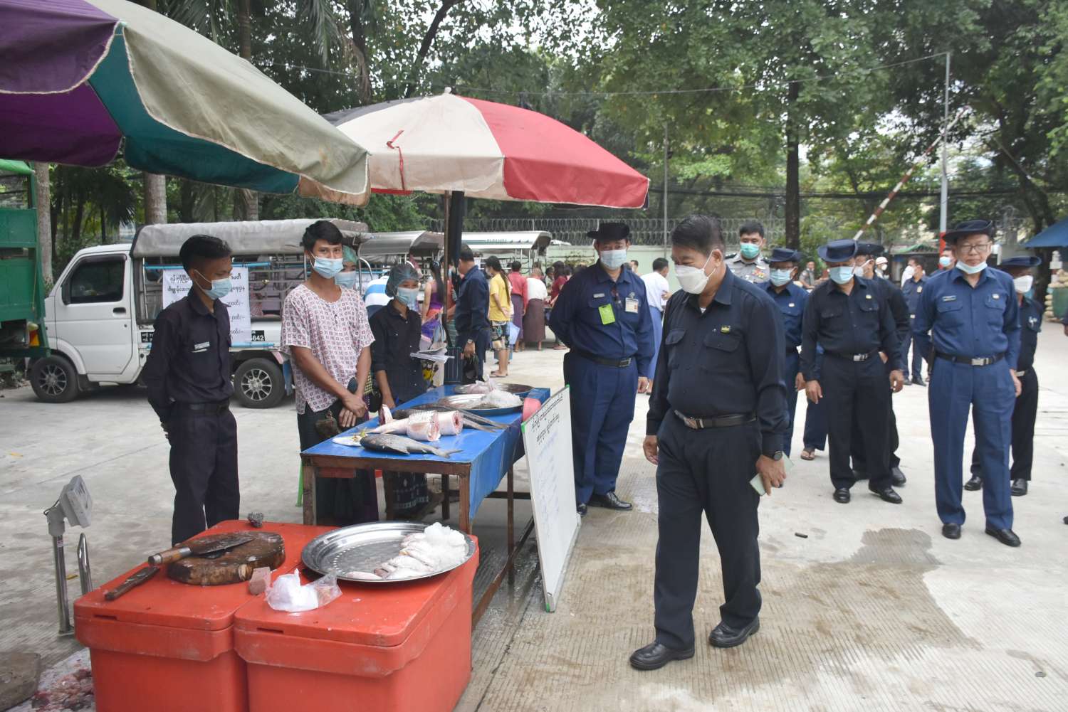 ရန်ကုန်တိုင်းဒေသကြီး စည်ပင်သာယာရေးဝန်ကြီး၊ ရန်ကုန်မြို့တော်ဝန် ဦးဗိုလ်ဌေးသည် ယနေ့နံနက် ၇ နာရီတွင် ကမာရွတ်မြို့နယ်၊ ဗဟိုလမ်းနှင့် ဟံသာဝတီ လမ်းထောင့်ရှိ စည်ပင်သာယာ ရဲတပ်ဖွဲ့(ရန်ကုန်) အိမ်ရာဝင်းအတွင်း ရွေ့လျားဈေးကား (Mobile Market) စနစ်ဖြင့် မြို့ပြပတ်ဝန်းကျင် ထိန်းသိမ်းရေးနှင့် သန့်ရှင်းရေးဌာနမှ ကြီးကြပ်ပြီး ဆိတ်သား၊ ဝက်သား၊ အမဲသား၊ ကြက်သား၊ ရေချို/ရေငန်၊ ငါး/ပုဇွန်အမျိုးမျိုး၊ ဟင်းသီးဟင်းရွက်နှင့် မီးဖိုချောင်သုံးပစ္စည်း အမျိုးမျိုးတို့ကို ဈေးနှုန်းချိုသာစွာဖြင့် ဝယ်ယူနိုင်ရန်နှင့် ကိုဗစ်-၁၉ ရောဂါ ထိန်းချုပ်နိုင်ရေးအတွက် ဈေးသို့သွားရန်မလိုဘဲ မိမိတို့နေအိမ်ဝင်း အတွင်း အလွယ်တကူ ဝယ်ယူနိုင်ရန် ရောင်းချနေမှုကို သွားရောက် ကြည့်ရှုစစ်ဆေးသည်။