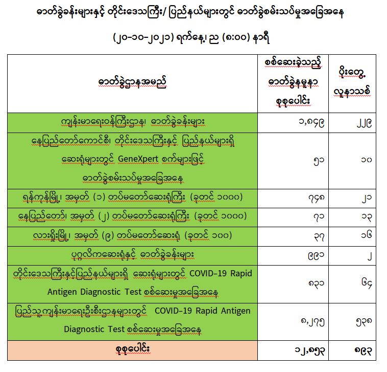 COVID-19 သံသယလူနာများ၊ ဓာတ်ခွဲအတည်ပြုလူနာနှင့် အနီးကပ်ထိတွေ့ခဲ့သူများနှင့် အသွားအလာကန့်သတ်ထားရှိသူများအား COVID-19 ရောဂါ ရှိ၊ မရှိ ဓာတ်ခွဲစမ်းသပ်စစ် ဆေးခြင်းအား ပုံမှန်ဆောင်ရွက်လျက်ရှိပြီး (၁၉-၁၀-၂၀၂၁) ရက်နေ့၊ ည (၈:၀၀) နာရီမှ (၂၀-၁၀-၂၀၂၁) ရက်နေ့၊ ည (၈:၀၀) နာရီအတွင်း ဓာတ်ခွဲနမူနာစုစုပေါင်း (၁၂,၈၅၃) ခုအား စစ်ဆေးပြီးစီးခဲ့ရာ COVID-19 ရောဂါ ဓာတ်ခွဲအတည်ပြု လူနာသစ် (၈၉၃)ဦး တွေ့ရှိရပါသည်။ ထို့ကြောင့် ယနေ့အတွက် ရောဂါပိုးတွေ့ရှိမှု ရာခိုင်နှုန်းမှာ (၆.၉၅) ရာခိုင်နှုန်းရှိပါသည်။