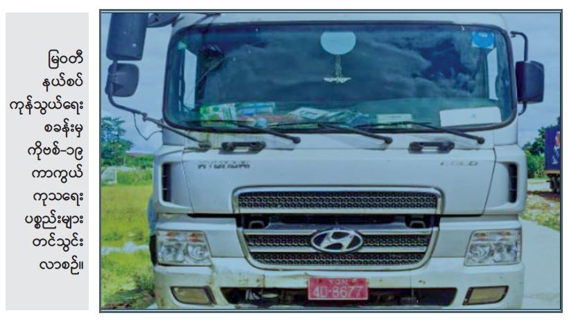 စီးပွားရေးနှင့် ကူးသန်းရောင်းဝယ်ရေးဝန်ကြီးဌာန အနေဖြင့် ကိုဗစ်-၁၉ ရောဂါ ကာကွယ်၊ ထိန်းချုပ်၊ ကုသရေးဆိုင်ရာ ပစ္စည်းများကို လေကြောင်း၊ ရေကြောင်းနှင့် နယ်စပ်ကုန်သွယ်ရေးစခန်းများမှ နှောင့်နှေးကြန့်ကြာမှုမရှိ တင်သွင်းနိုင်ရေးအတွက် အချိန်နှင့်တစ်ပြေးညီ စီစဉ်ဆောင်ရွက်ပေးလျက် ရှိရာ ယနေ့တွင် မြဝတီနှင့် ချင်းရွှေဟော် ကုန်သွယ် ရေးစခန်းနှစ်ခုတို့မှ တင်သွင်းရာ၌ ကုမ္ပဏီ ငါးခုမှ ယာဉ်စီးရေ ခုနစ်စီးဖြင့် အောက်ဆီဂျင်အရည် (Bowser) ယာဉ် တစ်စီးဖြင့် တန် ၂၀ နှင့် နှာခေါင်း စည်း (Mask) ၅၇ တန် တင်သွင်းခဲ့ပြီး အောက်ဆီဂျင် အရည် (Bowser) ယာဉ် တစ်စီးမှာ မြဝတီမြို့မှ ရန်ကုန်မြို့သို့ဖြစ်ကြောင်း သိရသည်။