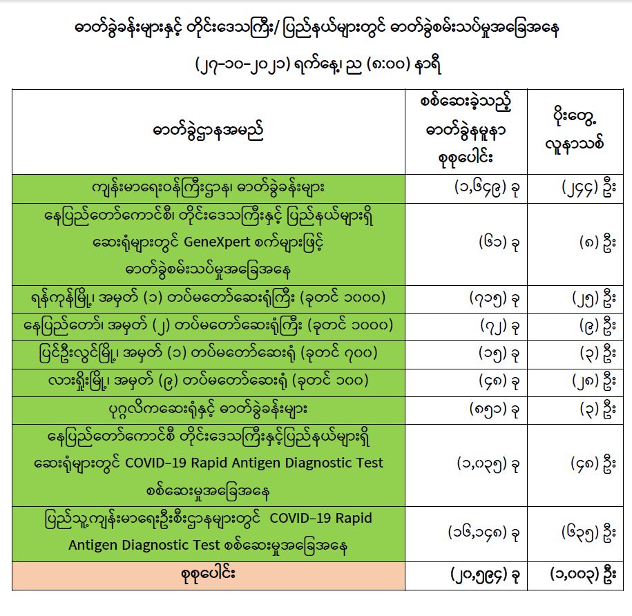 သို့ဖြစ်ပါ၍ ယနေ့အထိ ဓာတ်ခွဲနမူနာစုစုပေါင်း (၄,၇၉၁,၈၄၇)ခုအား စစ်ဆေးခဲ့ပြီး COVID-19 ဓာတ်ခွဲ အတည်ပြုလူနာ စုစုပေါင်း (၄၉၆,၉၀၁) ဦး ရှိပြီဖြစ်ပါသည်။