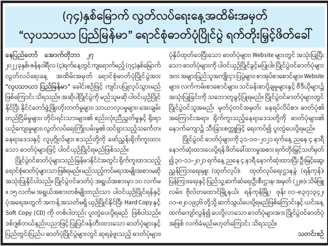 (၇၄) နှစ်မြောက် လွတ်လပ်ရေးနေ့ အထိမ်းအမှတ် "လှပသာယာ ပြည်မြန်မာ" ရောင်စုံပြိုင်ပွဲ ရက်တိုးမြှင့်ဖိတ်ခေါ် 10/28/2021