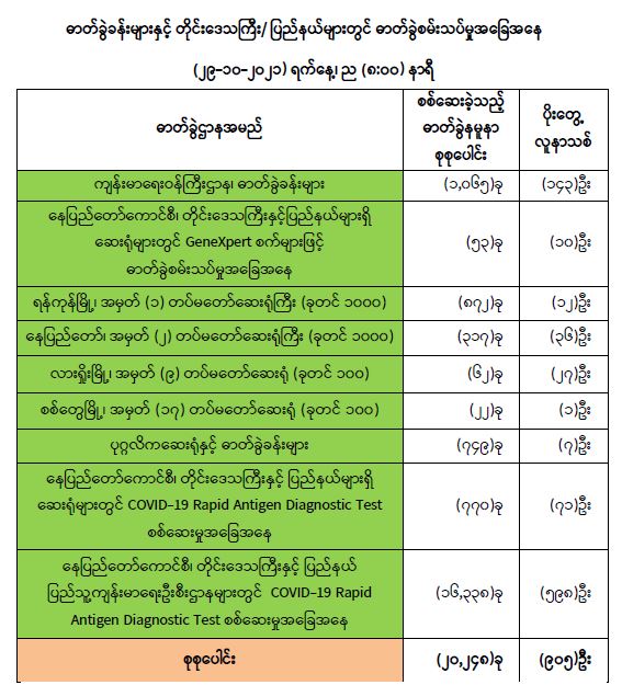 သို့ဖြစ်ပါ၍ ယနေ့အထိ ဓာတ်ခွဲနမူနာစုစုပေါင်း (၄,၈၃၀,၉၇၉) ခုအား စစ်ဆေးခဲ့ပြီး COVID-19 ဓာတ်ခွဲအတည်ပြုလူနာ စုစုပေါင်း (၄၉၈,၆၀၅) ဦးရှိပြီ ဖြစ်ပါသည်။