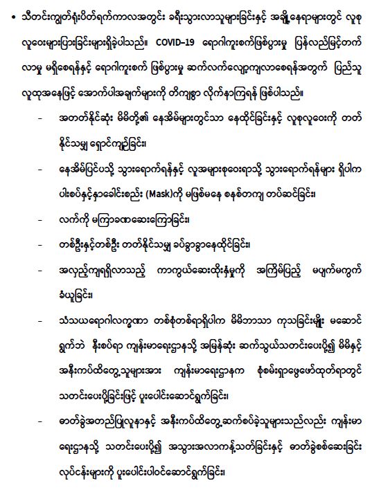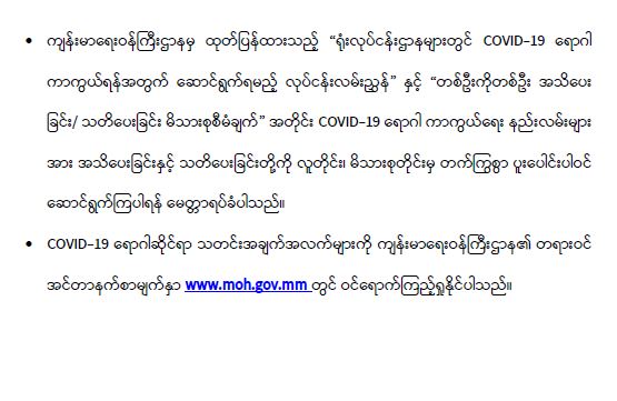 ကျန်းမာရေးဝန်ကြီးဌာနအနေဖြင့် နိုင်ငံအတွင်း ကူးစက်ဖြစ်ပွားနေသော COVID-19 ရောဂါ ကာကွယ်၊ ကုသ၊ ထိန်းချုပ်ရေး လုပ်ငန်းများကို အရှိန်အဟုန်မြှင့်ဆောင်ရွက်လျက်ရှိရာ ရောဂါ ထိန်းချုပ်ရေးလုပ်ငန်းများ အောင်မြင်နိုင်ရေးအတွက် ပြည်သူလူထု အနေဖြင့် ကျန်းမာရေး ဝန်ကြီးဌာနမှ ထုတ်ပြန်ထားသော COVID-19 ရောဂါ ကာကွယ်ထိန်းချုပ်ရေးဆိုင်ရာ စည်းကမ်းများကို စနစ်တကျ လိုက်နာဆောင်ရွက်ရန်လိုအပ်ပြီး COVID-19 ကာကွယ်ဆေးထိုးနှံမှု ခံယူခြင်းအား အထူးဂရုပြု ပူးပေါင်းဆောင်ရွက် ကြရန် လိုအပ်ပါသည်။