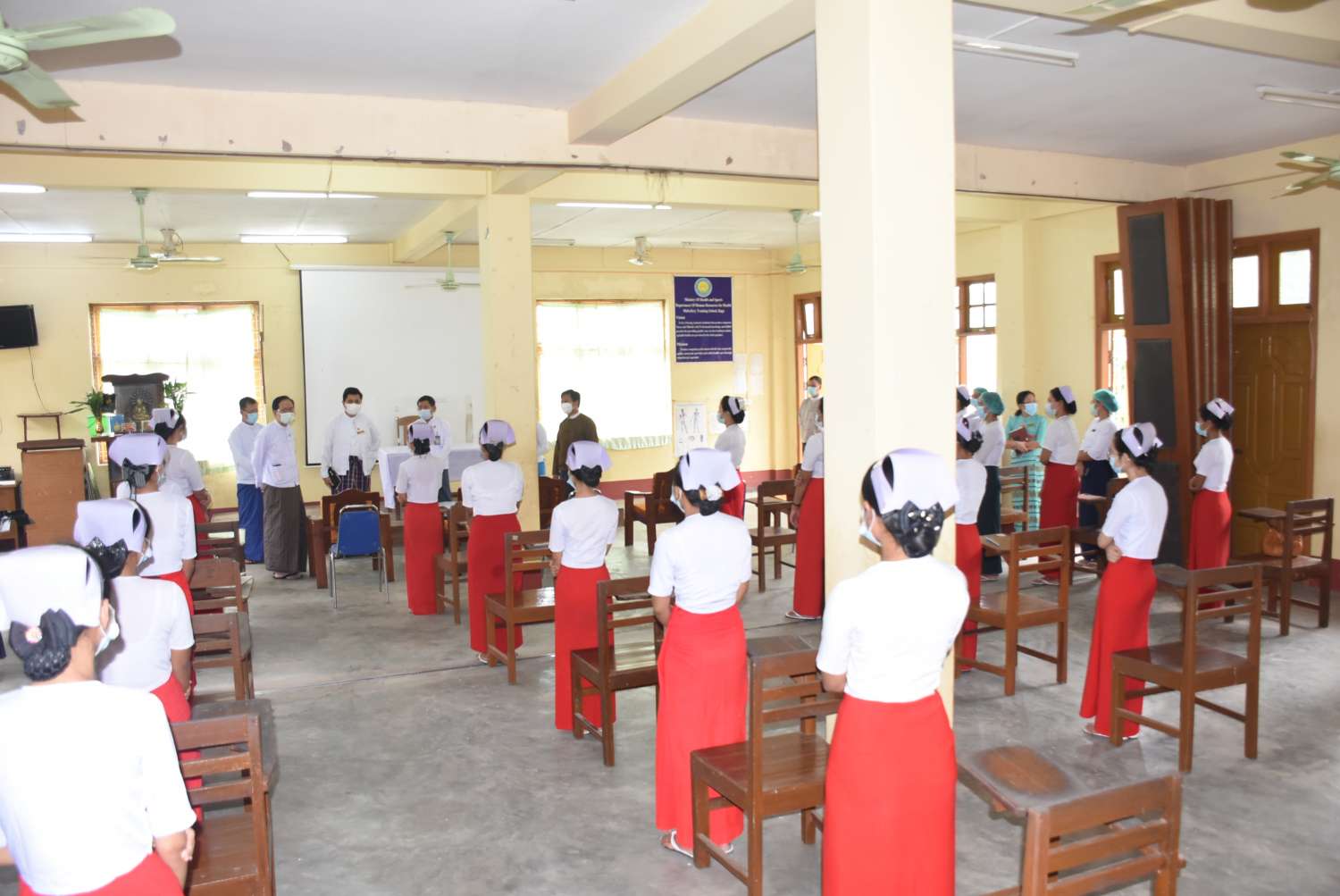 ယင်းနောက် ပြည်ထောင်စုဝန်ကြီးနှင့်အဖွဲ့သည် သားဖွားသင်တန်းကျောင်းသို့ သွားရောက်ကာ သင်တန်းသူများကို တွေ့ဆုံသည်။ အဆိုပါ ပဲခူးသားဖွားသင်တန်းကျောင်းတွင် ပဲခူးတိုင်းဒေသကြီး၊ ချင်းပြည်နယ်၊ ကယားပြည်နယ်မှ သင်တန်းသူများ တက်ရောက် လျက်ရှိကြောင်း သိရသည်။ ယင်းနောက် ပဲခူး(ကလိ)ရှိ တည်ဆောက်ဆဲ ဆေးရုံကြီး မြေနေရာ တွင် တိုင်းဒေသကြီးအစိုးရက လှူဒါန်းတပ်ဆင်ထားရှိသည့် Liquid Oxygen Tank ၊ Liquid Oxygen တန်(၃၀) သယ်ဆောင်နိုင်မည့် နောက်တွဲယာဉ်၊ Oxygen Plant တို့ကို ကြည့်ရှုစစ်ဆေးခဲ့ကြောင်း သိရသည်။