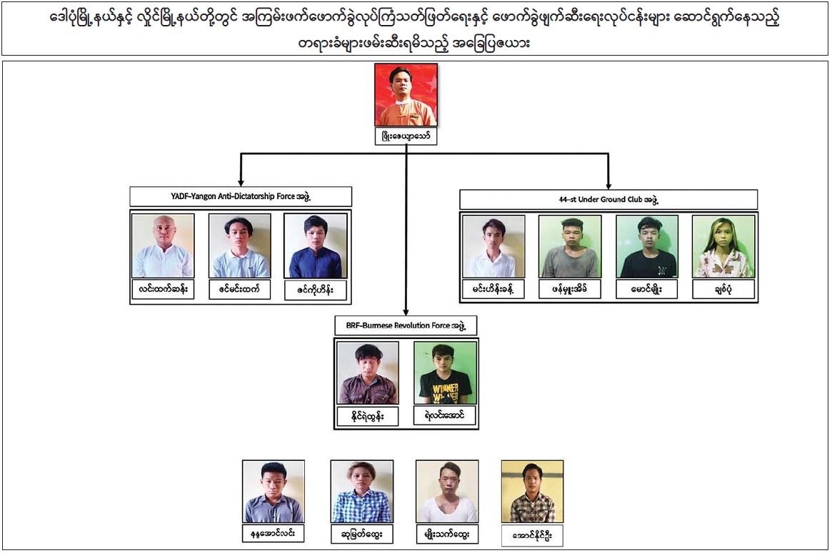 ဖမ်းဆီးရမိတရားခံ နိုင်ရဲထွန်းနှင့် ရဲလင်းအောင်တို့မှာ BRF-Burmese Revolution Force အဖွဲ့ဝင်အဖြစ် ပါဝင်၍ လည်းကောင်း၊ လင်းထက်ဆန်း၊ ဇင်မင်းထက်နှင့် ဇင်ကိုဟိန်းတို့မှာ YADF- Yangon Anti-Dictatorship Force အဖွဲ့ဝင် အဖြစ်ပါဝင်၍ လည်းကောင်း အဖျက်လုပ်ငန်းများအား လုပ်ဆောင်ခဲ့ကြောင်း သိရသည်။