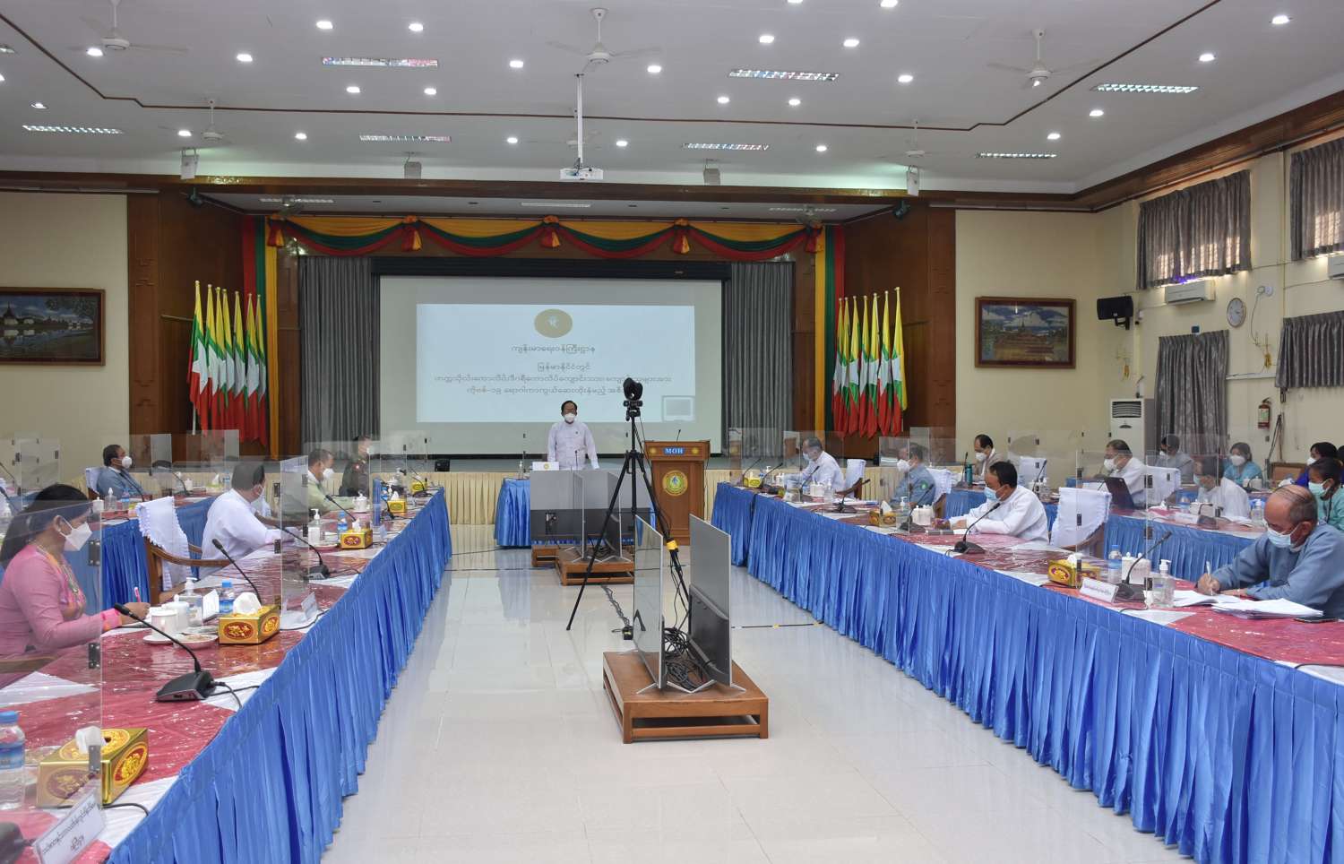 ဆက်လက်၍ ပြည်သူ့ကျန်းမာရေးဦးစီးဌာန၊ စီမံချက်မန်နေဂျာ (ဗဟိုတိုးချဲ့ ကာကွယ် ဆေးထိုးလုပ်ငန်း) က ကာကွယ်ဆေးထိုးနှံရေး အစီအစဉ်နှင့်ပတ်သက်၍ လည်းကောင်း၊ တပ်မတော် (ကြည်း၊ ရေ၊ လေ) သတင်းနှင့်နည်းပညာဌာန၊ ဌာနမှူးနှင့် ပြည်သူ့ကျန်းမာရေး ဦးစီးဌာန၊ ဒုတိယညွှန်ကြားရေးမှူးချုပ် (မကူးစက်)တို့က ကိုဗစ်-၁၉ ရောဂါ ကာကွယ်ဆေး ထိုးနှံခြင်းအတွက် ကာကွယ်ဆေးထိုးနှံခြင်း စီမံခန့်ခွဲမှု သတင်းအချက်အလက် စနစ် (VMIS) တွင် စာရင်းရေးသွင်းခြင်းနှင့် ပတ်သက်၍လည်းကောင်း၊ အထွေထွေအုပ်ချုပ်ရေး ဦးစီးဌာန၊ သယံဇာတနှင့် သဘာဝပတ်ဝန်းကျင် ထိန်းသိမ်းရေးဝန်ကြီးဌာန၊ ပညာရေးဝန်ကြီးဌာန၊ သိပ္ပံနှင့် နည်းပညာ ဝန်ကြီးဌာန၊ နယ်စပ်ရေးရာဝန်ကြီးဌာန၊ သာသနာရေးနှင့် ယဉ်ကျေးမှု ဝန်ကြီးဌာန၊ စိုက်ပျိုးရေး၊ မွေးမြူရေးနှင့် ဆည်မြောင်းဝန်ကြီးဌာန၊ သမဝါယမနှင့် ကျေးလက်ဖွံ့ဖြိုးရေး ဝန်ကြီးဌာန၊ ပို့ဆောင်ရေးနှင့် ဆက်သွယ်ရေးဝန်ကြီးဌာန၊ အားကစားနှင့် လူငယ်ရေးရာဝန်ကြီးဌာနနှင့် ကျန်းမာရေး လူ့စွမ်းအားအရင်းအမြစ် ဦးစီးဌာနတို့မှ တာဝန်ရှိသူများက အသီးသီး တင်ပြကြပြီး ပြည်ထောင်စုဝန်ကြီးက တင်ပြချက်တစ်ခုချင်းအလိုက် အသေးစိတ် ဆွေးနွေးပြော ကြားခဲ့ကြောင်း သိရသည်။