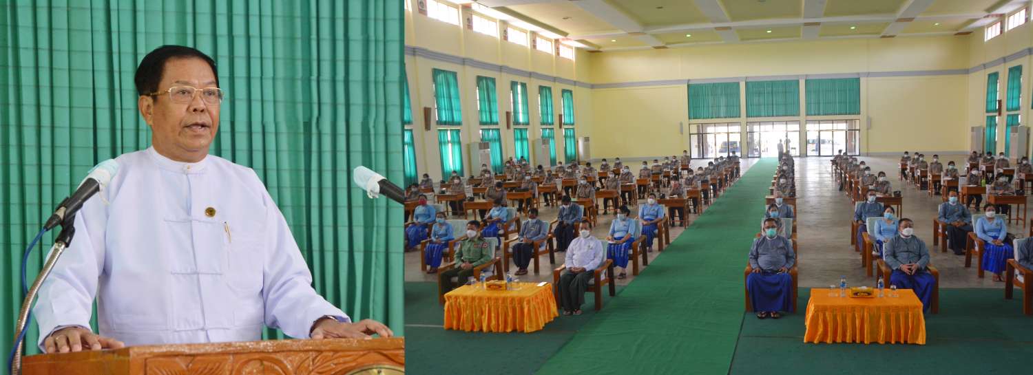 ဝန်ထမ်းကောင်းမှ နိုင်ငံကောင်းမည်” ဟူသောဆောင်ပုဒ်နှင့်အညီ နိုင်ငံ့ဝန်ထမ်းများသည် မည်သည့် အစိုးရအုပ်ချုပ်သည်ဖြစ်စေ နိုင်ငံတော်ယန္တရားကြီး ကောင်းမွန်ချောမွေ့စွာ လည်ပတ်နိုင်စေရန် တာဝန်ယူဆောင်ရွက်ပေးရသူများ ဖြစ်သည့်အတွက် နိုင်ငံ့ဝန်ထမ်းသစ္စာ အဓိဋ္ဌာန် (၆) ချက်ကို ဦးထိပ်ပန်ဆင်ပြီး နိုင်ငံတော်အစိုးရက ချမှတ်ထားသော မူဝါဒ၊ လုပ်ငန်း စဉ်များကို အကောင်အထည်ဖော် ဆောင်ရွက်သွားကြရမည်ဖြစ်ကြောင်း၊ နိုင်ငံတော်နှင့် ပြည်သူ၏ အကျိုးစီးပွားအတွက် တာဝန်ယူမှု၊ တာဝန်ခံမှု စိတ်ဓာတ်အပြည့်ဖြင့် မိမိတို့၏ လုပ်ငန်းတာဝန်များကို ကြိုးစားထမ်းဆောင်သွားရန် တိုက်တွန်းလိုပါကြောင်း၊ ကိုဗစ် ရောဂါ ကူးစက်မှုကာလအတွင်း ဖွင့်လှစ်ရသော သင်တန်းဖြစ်၍ သတ်မှတ်ထားသည့် စည်းကမ်း ချက်များကို တိကျစွာလိုက်နာ ဆောင်ရွက်သွားရန် အထူးမှာကြားလိုပါကြောင်း ပြောကြား သည်။
