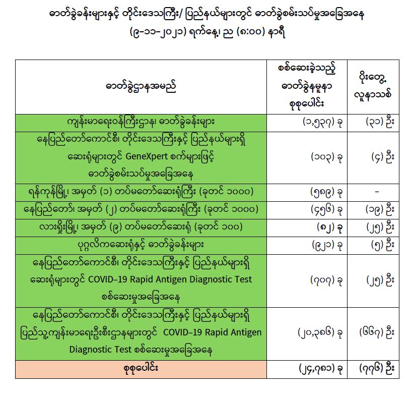 သို့ဖြစ်ပါ၍ ယနေ့အထိ ဓာတ်ခွဲနမူနာစုစုပေါင်း (၅,၀၈၂,၀၇၃) ခု အားစစ်ဆေးခဲ့ပြီး COVID-19 ဓာတ်ခွဲအတည်ပြုလူနာ စုစုပေါင်း (၅၀၈,၅၉၁) ဦး ရှိပြီ ဖြစ်ပါသည်။