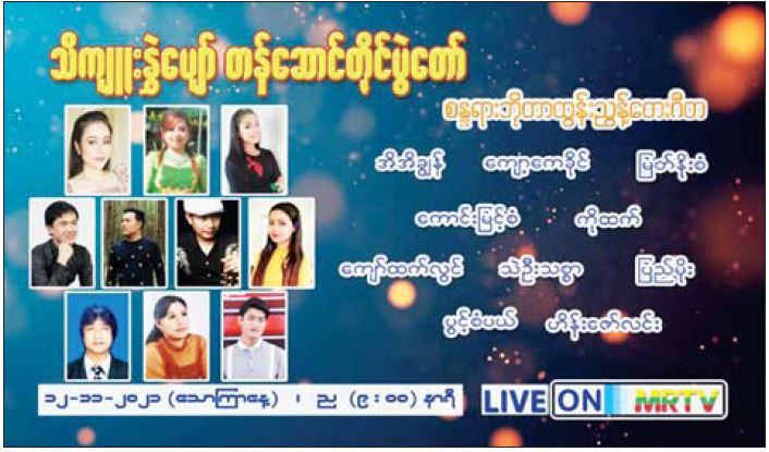 ယင်းအစီအစဉ်ကို “စန္ဒရား ဘိုတာထွန်းညွန့် တေးဂီတအဖွဲ့” ၏ တီးခတ်မှုနှင့်အတူ တေးသံရှင်များ ဖြစ်ကြသည့် အိအိချွန်၊ ကျော့ကေခိုင်၊ မြတ်နိုးစံ၊ ကောင်းမြင့်စံ၊ ကိုထက်၊ ကျော်ထက်လွင်၊ သဲဦးသစ္စာ၊ ပြည်မိုး၊ ပွင့်စံပယ်နှင့် ဟိန်းဇော်လင်းတို့က ဖျော်ဖြေတင်ဆက်ကြမည် ဖြစ်သည်။