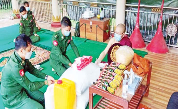 ကိုဗစ်-၁၉ ရောဂါ ကြိုတင်ကာကွယ်ရေးလုပ်ငန်းများ ဆောင်ရွက်နေသည့်ကာလ အတွင်း ဆွမ်းကိစ္စရပ်များ အဆင်ပြေစေရန်ရည်ရွယ်၍ တပ်မတော်(ကြည်း၊ရေ၊ လေ) အရာရှိ၊ စစ်သည်၊ အရာထမ်း၊ အမှုထမ်းများနှင့် စေတနာရှင်အလှူရှင်များက မြို့နယ် အသီးသီးရှိ ဘုန်းတော်ကြီး ကျောင်းများ၊ သာသနာနွယ်ဝင် သီလရှင်ကျောင်းများနှင့် ဘာသာရေးကျောင်းများသို့ ဆွမ်းဆန်တော်၊ ဆီ၊ ဆား၊ ပဲ အမယ်(၄)မျိုးနှင့် လှူဖွယ် ပစ္စည်းများလှူဒါန်းခြင်း၊ နေ့ဆွမ်းများ ဆက်ကပ်လှူဒါန်းခြင်းနှင့် ကျန်းမာရေး စစ်ဆေး ပေးခြင်းများကို ဆောင်ရွက်လျက် ရှိသည်။