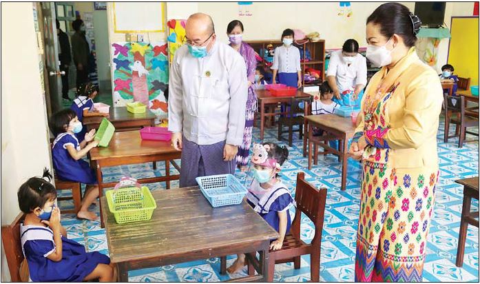 ယင်းနောက် ရှေးဦးအရွယ် ကလေးသူငယ်ပြုစု ပျိုးထောင်ရေးနှင့် ဖွံ့ဖြိုးရေးလုပ်ငန်း ဗဟိုကြီးကြပ်ရေး အဖွဲ့ဥက္ကဋ္ဌ၊ ပြည်ထောင်စုဝန်ကြီး ဒေါက်တာ သက်သက်ခိုင်နှင့် ဒုတိယဝန်ကြီးတို့သည် နေပြည်တော် ပြည်ထောင်စုနယ်မြေအတွင်း လူမှုဝန်ထမ်း ဦးစီးဌာနမှ ဖွင့်လှစ်ထားရှိသော မူလတန်းကြို ကျောင်းများသို့ ရောက်ရှိပြီး ကိုဗစ်-၁၉ ရောဂါ ကာကွယ် ထိန်းချုပ်ရေးဆိုင်ရာ စည်းကမ်းချက် များနှင့်အညီ ရင်သွေးငယ်များ အသက်အရွယ်အလိုက် ဘက်စုံဖွံ့ဖြိုးမှု ရရှိစေရန်နှင့် ဘဝတစ်သက်တာ အတွက် အခြေခံ အလေ့အကျင့်ကောင်းများ ရရှိစေရန် သင်ကြားမှုပုံများ ပြင်ဆင်ထားရှိမှုနှင့် ရင်သွေးငယ်များ မူလတန်းကြို ပညာရေး တက်ရောက်သင်ယူနေမှုတို့ကို လှည့်လည်ကြည့်ရှုသည်။