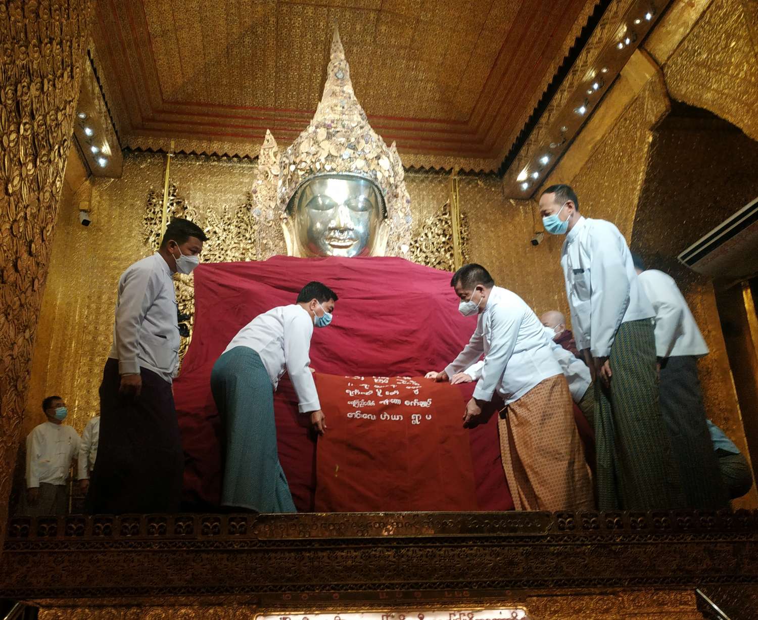 ဆက်လက်၍ နံနက် ၅ နာရီတွင် မဟာမုနိဂေါပကအဖွဲ့မှ ကြီးမှူး၍ မဟာမုနိရုပ်ရှင် တော်မြတ်ကြီးအား (၃၂) ကြိမ်မြောက် မသိုးမြတ်သင်္ကန်းတော် ရက်လုပ်ပူဇော်ပွဲကို ကိုဗစ်-၁၉ ကာကွယ်ရေး စည်းကမ်းချက်များနှင့်အညီ ကျင်းပရာ ပူဇော်မည့် တဘက်တော်နှင့် မသိုးသင်္ကန်းတော်မြတ်ကို တိုင်းဒေသကြီးဝန်ကြီးချုပ်၊ အလယ်ပိုင်းတိုင်းစစ်ဌာနချုပ် တိုင်းမှူး၊ တိုင်းဒေသကြီး အစိုးရအဖွဲ့ ဝန်ကြီးများနှင့် အဖွဲ့ဝင်များအား စက်ချုပ်အဖွဲ့နှင့် တဘက်ပညာ ရှင်များက ပေးအပ်ကြသည်။