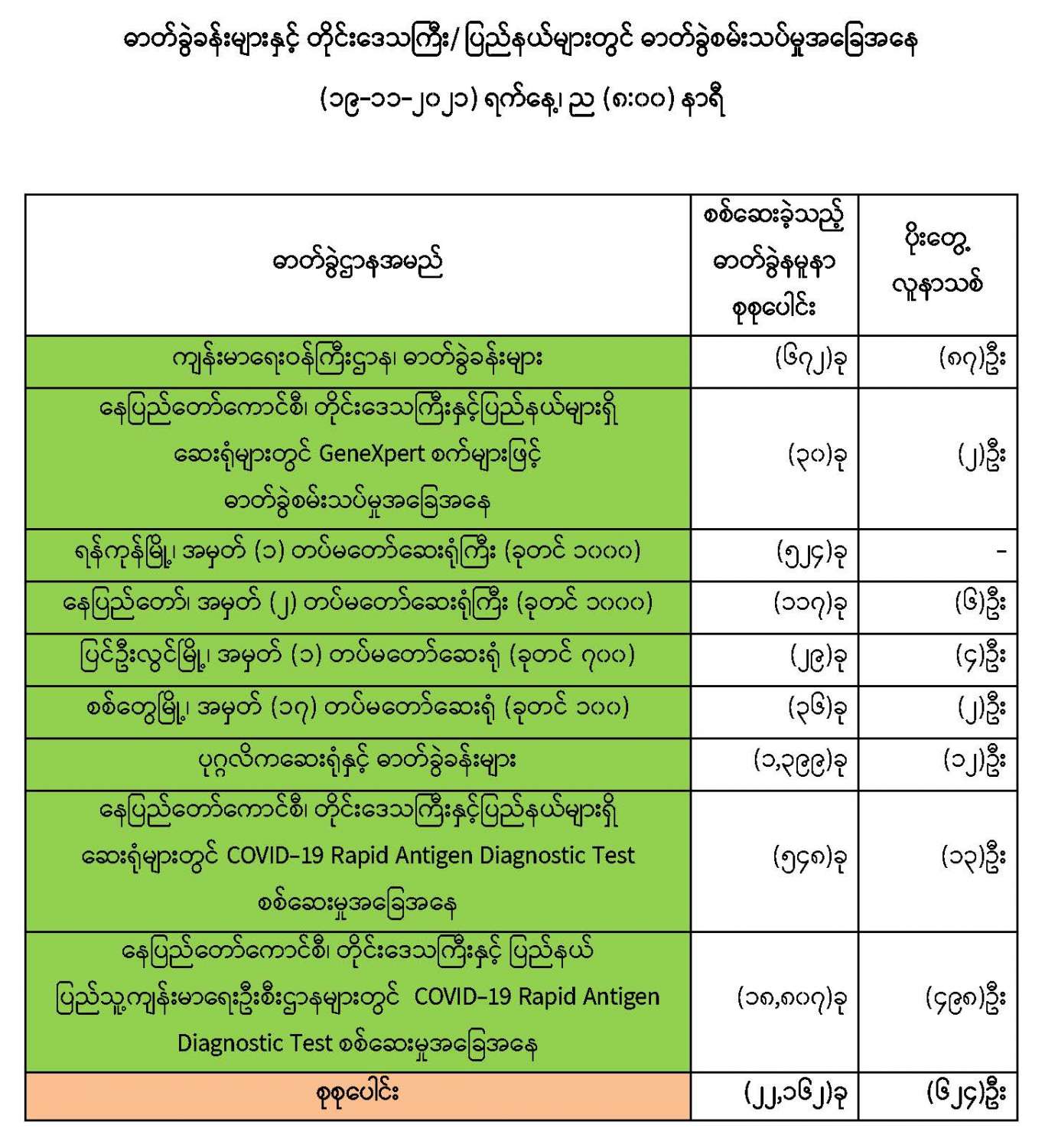 သို့ဖြစ်ပါ၍ ယနေ့အထိ ဓာတ်ခွဲနမူနာစုစုပေါင်း (၅,၃၂၆,၂၅၆) ခုအား စစ်ဆေးခဲ့ပြီး COVID-19 ဓာတ်ခွဲ အတည်ပြုလူနာ စုစုပေါင်း (၅၁၆,၇၇၀) ဦး ရှိပြီ ဖြစ်ပါသည်။