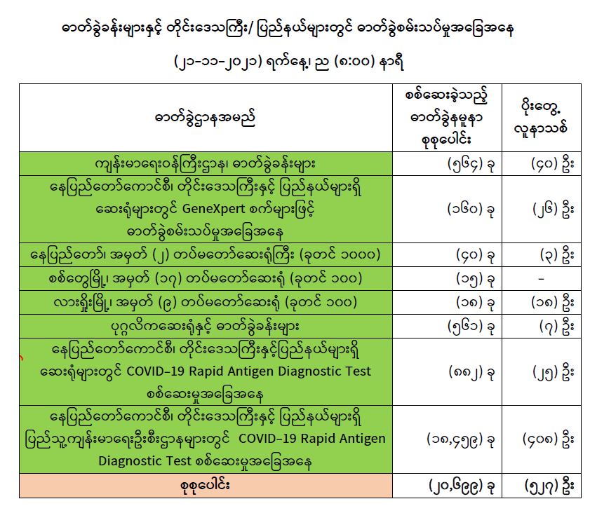 သို့ဖြစ်ပါ၍ ယနေ့အထိ ဓာတ်ခွဲနမူနာစုစုပေါင်း (၅,၃၇၁,၈၁၀)ခုအား စစ်ဆေးခဲ့ပြီး COVID-19 ဓာတ်ခွဲ အတည်ပြုလူနာ စုစုပေါင်း (၅၁၇,၉၂၂) ဦး ရှိပြီ ဖြစ်ပါသည်။