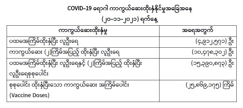 COVID-19 ရောဂါ ကာကွယ်ထိန်းချုပ်ရေးအတွက် တိုင်းဒေသကြီး/ပြည်နယ်များတွင် COVID-19 ရောဂါကာကွယ်ဆေးကို ဦးတည်အုပ်စုများသတ်မှတ်၍ ထိုးနှံပေးလျက်ရှိရာ (၂၀-၁၁-၂၀၂၁) ရက်နေ့ အထိ လူဦးရေ စုစုပေါင်း (15,390,873) ဦးအား ထိုးနှံပေးပြီးဖြစ်၍ ကာကွယ်ဆေးနှစ်ကြိမ် အပြည့် ထိုးနှံပြီးစီးသူ (10,478,302) ဦး နှင့် ပထမအကြိမ်ထိုးနှံပြီးစီးသူ (4,912,571) ဦး ရှိပြီဖြစ် ပါသည်။ သို့ဖြစ်ပါ၍ (၂၀-၁၁-၂၀၂၁) ရက်နေ့အထိ မြန်မာနိုင်ငံတွင် COVID-19 ရောဂါ ကာကွယ်ဆေးအကြိမ်ရေ စုစုပေါင်း (25,869,175) ကြိမ် ထိုးနှံပြီး ဖြစ်ပါသည်။