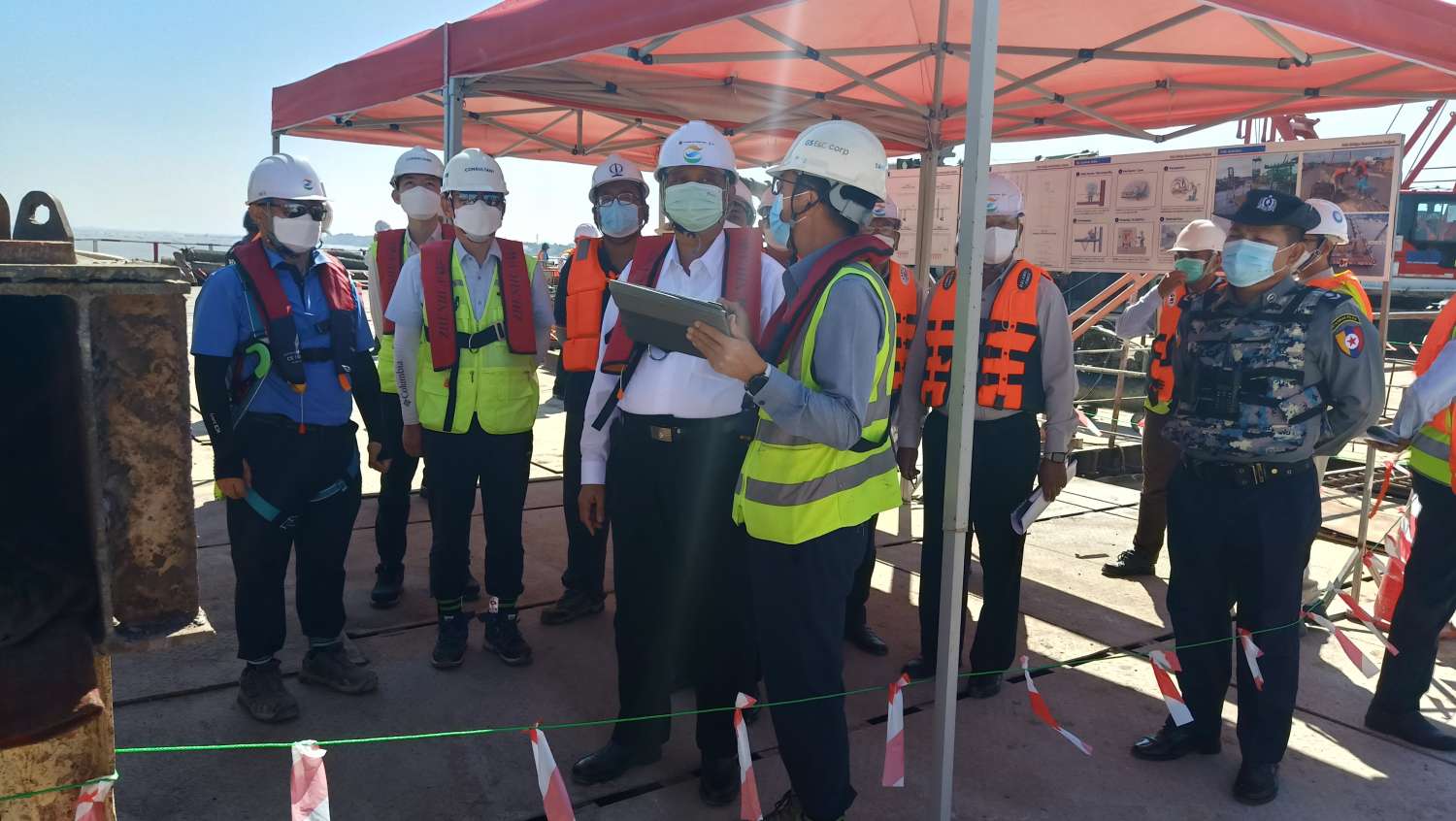 ထို့နောက် ပြည်ထောင်စုဝန်ကြီးနှင့်အဖွဲ့သည် ဒလတံတားတည်ဆောက်ရေး လုပ်ငန်းခွင် (ရန်ကုန်ဘက်ကမ်း)သို့ရောက်ရှိရာ ရှင်းလင်းဆောင်တွင် တာဝန်ရှိသူများက လုပ်ငန်းဆောင် ရွက်နေမှုအခြေအနေများကို ရှင်းလင်းတင်ပြသည်။