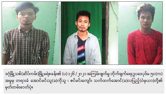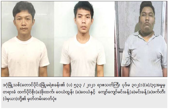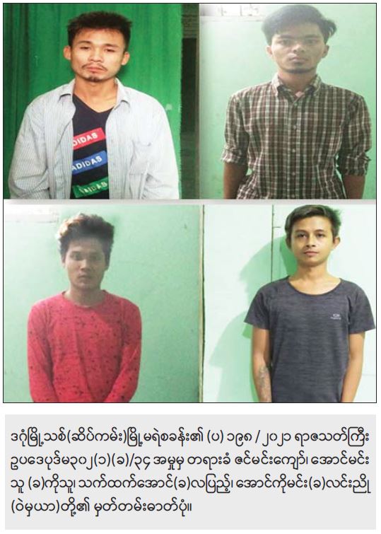ရန်ကုန်တိုင်းဒေသကြီး၊ လှိုင်သာယာ(အရှေ့ပိုင်း)မြို့နယ်၊ ရွှေလင်ပန်း ကျေး ရွာ၌ ကျော်မိုးနိုင်(ခ)မောင်နိုင်(ဘ)ဦးမြင့်ဦး အပါအဝင် ၁၈ ဦးသည် စက်တင်ဘာ ၂၈ ရက် ည ၁၀ နာရီခန့်တွင် ကျူးကျော်နေအိမ်နှင့် အိမ်ခြံမြေကိစ္စများတွင် အခကြေး ငွေရယူ၍ နေအိမ်များနှင့် ခြံစည်းရိုးများအား ဖျက်ဆီးခြင်း၊ နေအိမ်အတွင်းရှိ လူများ အား တုတ်၊ ဓားများ ကိုင်ဆောင်၍ အကြမ်းဖက်တိုက်ခိုက် ခြိမ်းခြောက်ခြင်းစသည့် ဉပဒေမဲ့လုပ်ရပ်များကို ကျူးလွန်ခဲ့သည့် အတွက်ကြောင့် အကြမ်းဖက်မှုတိုက်ဖျက် ရေးဉပဒေပုဒ်မ ၅၀(က)ဖြင့်လည်းကောင်း၊ ရဲထက်(ဘ) ဦးသိန်းဦး သည် ဧပြီ ၁၀ ရက်နေ့မှ ၁၇ ရက်အထိ တိုင်းရင်းသားလက်နက်ကိုင်အဖွဲ့ နယ်မြေအတွင်း သင်တန်းတက်ရောက်ခဲ့သဖြင့် ပြည်ထောင်စုသမ္မတမြန်မာနိုင်ငံတော် အကြမ်းဖက် မှုတိုက်ဖျက်ရေး ဗဟိုအဖွဲ့၊ အမိန့်ကြေညာစာအမှတ်၊(၂/၂၀၂၁)အရ အကြမ်းဖက်မှု တိုက်ဖျက်ရေးဉပဒေပုဒ်မ ၅၀(ည)ဖြင့် လည်းကောင်း၊ မောင်မောင်ကျော်တင့်(ခ) ဘိုဘိုကျော် (ဘ)ဦးလှတင့်သည် ဖေဖော်ဝါရီလမှစ၍ CRPH၊ NUG၊ PDF အမည်ခံ အကြမ်းဖက်အဖွဲ့များအား ငွေကြေးဆိုင်ရာ ထောက်ပံ့ပေးခဲ့မှုဖြင့် အကြမ်းဖက်မှု တိုက်ဖျက်ရေး ဉပဒေပုဒ်မ ၅၀(ည)ဖြင့် လည်းကောင်း၊ ရဲထက်အောင်(ခ)ရဲထက် (ဘ)ဦးညွန့်အောင်သည် ဖေဖော်ဝါရီလမှစ၍ ရန်ကုန်တိုင်းဒေသကြီး အတွင်း ဆူပူအကြမ်းဖက်မှု ဖြစ်စဉ်များတွင် တတ်ကြွစွာပါဝင်လှုပ်ရှားခြင်း၊ အပြစ်မဲ့ပြည်သူ များအား ဒလန်ဟု စွပ်စွဲ ပြောဆိုသတ်ဖြတ်ခြင်းတို့တွင် ပါဝင်ခြင်း၊ အကြမ်းဖက်ဗုံးခွဲ တိုက်ခိုက်ခြင်းများကို ဆောင်ရွက်ခဲ့သဖြင့် အကြမ်းဖက်မှုတိုက်ဖျက်ရေး ဥပဒေပုဒ်မ ၅၀(ဈ)ဖြင့် လည်းကောင်း၊ အောင်မင်းသူ(ခ)ကိုသူ(ဘ)ဦးထိန်ဝင်း အပါအဝင် ၈ ဦးသည် ဧပြီ ၂၈ ရက်မှစ၍ တိုင်းရင်းသား လက်နက်ကိုင်အဖွဲ့ နယ်မြေအတွင်း သင်တန်းတက်ရောက်ခြင်း၊ အုပ်ချုပ်ရေးမှူးရုံးများအား ဖောက်ခွဲဖျက်ဆီးခြင်း များကို ဆောင်ရွက်ခဲ့ပြီး ပြည်ထောင်စုသမ္မတမြန်မာနိုင်ငံတော် အကြမ်းဖက်မှု တိုက်ဖျက်ရေးဗဟိုအဖွဲ့၊ အမိန့်ကြေညာစာအမှတ်၊(၂/၂၀၂၁)အရ အကြမ်းဖက်မှု တိုက်ဖျက်ရေး ဥပဒေပုဒ်မ ၅၀(က)ဖြင့် လည်း ကောင်း စစ်အုပ်ချုပ်ရေး (Martial Law) စစ်ခုံရုံးဖွဲ့၍ စစ်ဆေးမှုများဆောင်ရွက်ခဲ့ရာ နိုဝင်ဘာ ၂၃ ရက်တွင် ၎င်းတို့ ၂၉ ဦးအား “ထောင်ဒဏ်တစ်သက် ”ပြစ်ဒဏ်အား အသီးသီး အမိန့်ချမှတ်လိုက်ကြောင်း သိရှိရသည်။