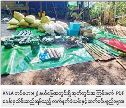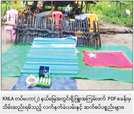 မတ်လ ၃၁ ရက်တွင် တောင်ငူမြို့၊ အမေ့အိမ်ဟိုတယ်၌ အကြမ်းဖက် UNRA အဖွဲ့ဝင် တရားခံ မျိုးမြင့်အောင်(ခ)အရှည်ကြီး(ခ)ဆံရှည်၊ ဩဂုတ်လ ၂၃ ရက်တွင် ဒဂုံဆိပ်ကမ်း မြို့နယ်၌ Music Zone KTV ၊ ကမာရွတ်၊ မြောက်ဥက္ကလာနှင့် သင်္ဃန်းကျွန်းမြို့နယ်တို့ရှိ EPC ရုံးများ အပါအဝင် ရန်ကုန်မြို့တွင်း ဖောက်ခွဲဖျက်ဆီးရေးလုပ်ငန်းများ ဆောင်ရွက်ခဲ့သော တရားခံများ ဖမ်းဆီးရမိမှု ဖြစ်စဉ်မှ ဝေယံသိန်း(ခ)ဗစ်တာနှင့် နိုဝင်ဘာလ ၁ ရက်တွင် တောင်ငူမြို့၌ ဖမ်းဆီးရမိ တရားခံ ကျော်ကျော်(ခ) ကချင်ကျော်ကျော်တို့၏ ထွက်ဆိုချက်များအရ ထန်းတပင်မြို့နယ်၊ တောကုန်း ကျေးရွာ၏ အရှေ့ဘက်တောင်ကုန်းများ၌ ပြည်မြို့နယ် NLD ပါတီမှ အမှတ်(၂)တိုင်းဒေသကြီး လွှတ်တော်ကိုယ်စားလှယ်ဟောင်း ကျော်ဇေယျ၏ ပြည်အကြမ်းဖက် PDF အဖွဲ့၊ တောင်ငူမြို့နယ် NLD ပါတီမှ အမှတ်(၂)တိုင်းဒေသကြီး လွှတ်တော်ကိုယ်စားလှယ်ဟောင်း မိုးမခ၏ တောင်ငူအကြမ်းဖက် PDF အဖွဲ့၊ ဖြူးမြို့နယ် NLD ပါတီမှ ပြည်သူ့လွှတ်တော်ကိုယ်စားလှယ်ဟောင်း ကျော်အေးဝင်း၏ ဖြူးအကြမ်းဖက် PDF အဖွဲ့များ သည် KNLA တပ်မဟာ(၂)မှ စစ်ဆင်ရေးမှူးအဆင့်ရှိ မောင်ရွှေနှင့် ညှိနှိုင်း၍ PDF အကြမ်းဖက်သင်တန်းများ ဖွင့်လှစ်၍ အဖျက်အမှောင့်လုပ်ငန်းများ ဆောင်ရွက်ကာ အပြစ်မဲ့ပြည်သူများအား လုပ်ကြံသတ်ဖြတ်ခြင်းများ ဆောင်ရွက်နေကြောင်း သိရှိရသဖြင့် တပ်မတော်က နယ်မြေစိုးမိုးရေး ဆောင်ရွက်ခဲ့ရာ PDF အကြမ်းဖက် စခန်းနေရာ ၅ နေရာအား ဖော်ထုတ်သိမ်းပိုက်ရရှိခဲ့ပြီး အဆိုပါစခန်းများအတွင်းမှ အကြမ်းဖက်သမား ၅ ဦး အပါအဝင် လက်နက်/ခဲယမ်းနှင့် ဆက်စပ်ပစ္စည်းများအား သိမ်းဆည်းရမိခဲ့ကြောင်း သိရှိရသည်။
