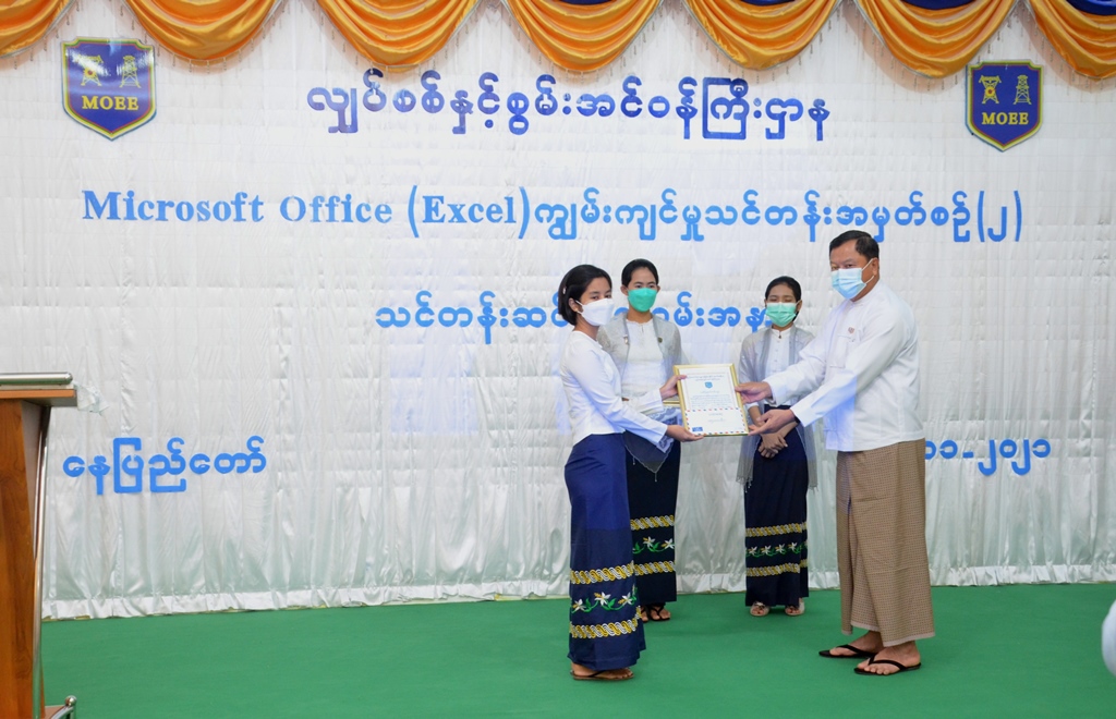 လျှပ်စစ်နှင့်စွမ်းအင်ဝန်ကြီးဌာန Microsoft Office (Excel) ကွန်ပျူတာ ကျွမ်းကျင်မှုသင်တန်းဆင်းပွဲ အခမ်းအနားကို ယနေ့နံနက် ၉ နာရီခွဲတွင် နေပြည်တော်ရှိ လျှပ်စစ်နှင့်စွမ်းအင်ဝန်ကြီးဌာန ဗဟိုသင်တန်း ကျောင်း၌ ကိုဗစ်-၁၉ ကာကွယ်ရေးနည်းစနစ်များနှင့်အညီ ကျင်းပသည်။
