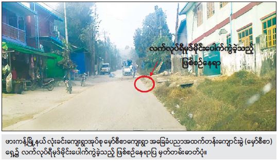 ယင်းသို့လုပ်ဆောင်လျက်ရှိရာ ယနေ့နံနက် ၈ နာရီခွဲခန့်တွင်လည်း ကချင်ပြည် နယ်၊ ဖားကန့်မြို့နယ်၊ လုံးခင်းကျေးရွာအုပ်စု၊ မှော်စီစာကျေးရွာရှိ အခြေခံပညာ အထက်တန်းကျောင်းခွဲရှေ့၌ KIA အဖွဲ့နှင့် PDF အမည်ခံ အကြမ်းဖက်အဖွဲ့များ ထောင်ထားသည့် လက်လုပ်ရီမုမိုင်း ၁ လုံး ပေါက်ကွဲမှုဖြစ်ပွားခဲ့ကြောင်း သိရှိရသည်။