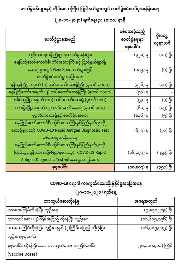 COVID-19 ရောဂါ ကာကွယ်ထိန်းချုပ်ရေးအတွက် တိုင်းဒေသကြီး/ပြည်နယ်များတွင် COVID-19 ရောဂါကာကွယ်ဆေးကို ဦးတည်အုပ်စုများသတ်မှတ်၍ ထိုးနှံပေးလျက်ရှိရာ (၂၇-၁၁-၂၀၂၁) ရက်နေ့ အထိ လူဦးရေ စုစုပေါင်း (၁၆,၄၈၅,၃၁၅) ဦးအား ထိုးနှံပေးပြီးဖြစ်၍ ကာကွယ်ဆေး နှစ်ကြိမ် အပြည့်ထိုးနှံပြီးစီးသူ (၁၁,၆၁၅,၀၉၆) ဦး နှင့် ပထမအကြိမ်ထိုးနှံပြီးစီးသူ (၄,၈၇၀,၂၁၉) ဦး ရှိပြီဖြစ်ပါသည်။ သို့ဖြစ်ပါ၍ (၂၇-၁၁-၂၀၂၁) ရက်နေ့အထိ မြန်မာနိုင်ငံတွင် COVID-19 ရောဂါ ကာကွယ်ဆေးအကြိမ်ရေ စုစုပေါင်း (၂၈,၁၀၀,၄၁၁) ကြိမ် ထိုးနှံပြီး ဖြစ်ပါသည်။