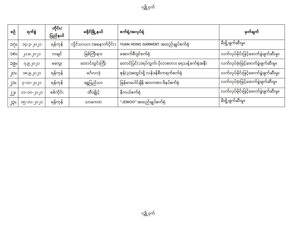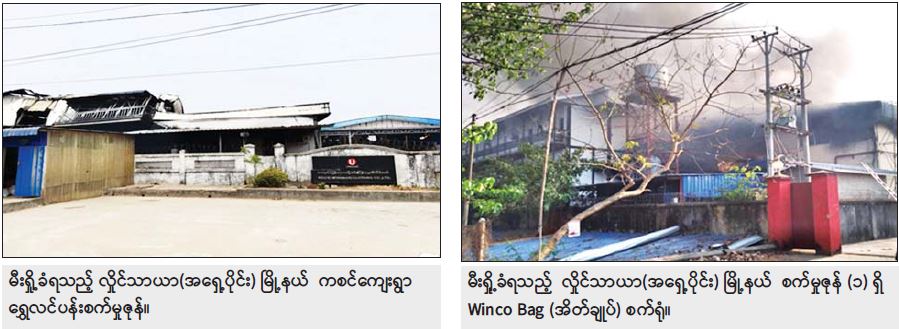 ထိုသို့ အကြမ်းဖက်အဖွဲ့များ၏ အကြောင်းမဲ့ မိုင်းထောင်ဖောက်ခွဲ၊ မီးရှို့ ဖျက်ဆီးခြင်း စသည့် အကြမ်း ဖက်လုပ်ရပ်များ လုပ်ဆောင်ခဲ့ခြင်းကြောင့် ၂၀၂၁ ခုနှစ် ဖေဖော်ဝါရီ ၁ ရက်မှ နိုဝင်ဘာ ၂၀ ရက်အထိ စက်ရုံ၊ အလုပ်ရုံ ၂၃ ခုတို့ ပျက်စီးဆုံးရှုံးခဲ့ရမှုကို ဖော်ပြပါအတိုင်း တွေ့ရှိရသည်-