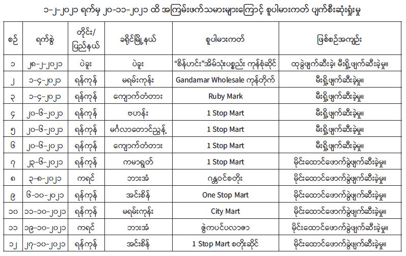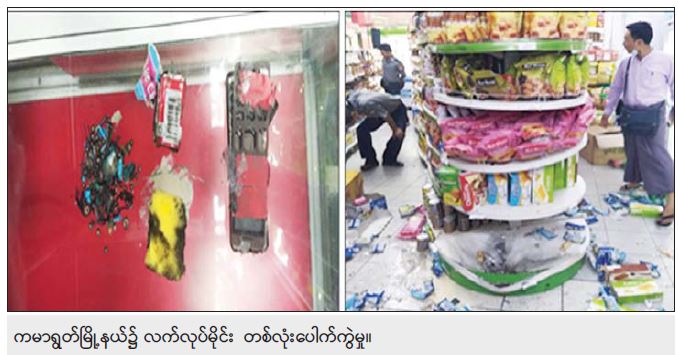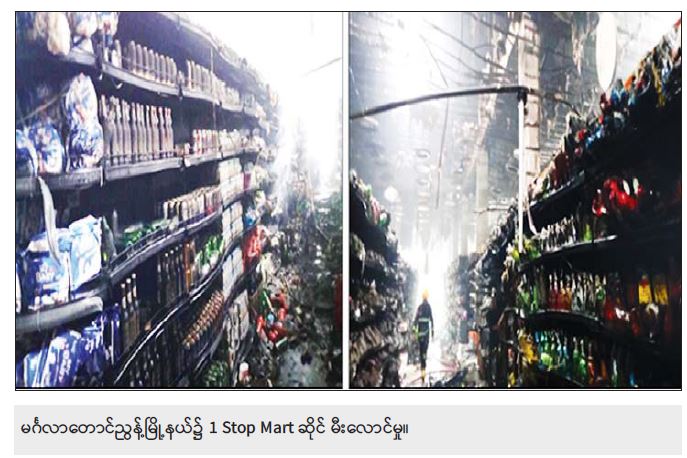 ထိုသို့ အကြမ်းဖက်အဖွဲ့များ၏ အကြောင်းမဲ့မိုင်းထောင်ဖောက်ခွဲ၊ မီးရှို့ ဖျက်ဆီးခြင်းစသည့် အကြမ်းဖက် လုပ်ရပ်များ လုပ်ဆောင်ခဲ့ခြင်းကြောင့် ၂၀၂၁ ခုနှစ် ဖေဖော်ဝါရီ ၁ ရက်မှ နိုဝင်ဘာ ၂၀ ရက်အထိ စူပါမားကတ်၁၂ ခု ပျက်စီးဆုံးရှုံးခဲ့ရမှုကို ဖော်ပြပါအတိုင်း တွေ့ရှိရသည်-